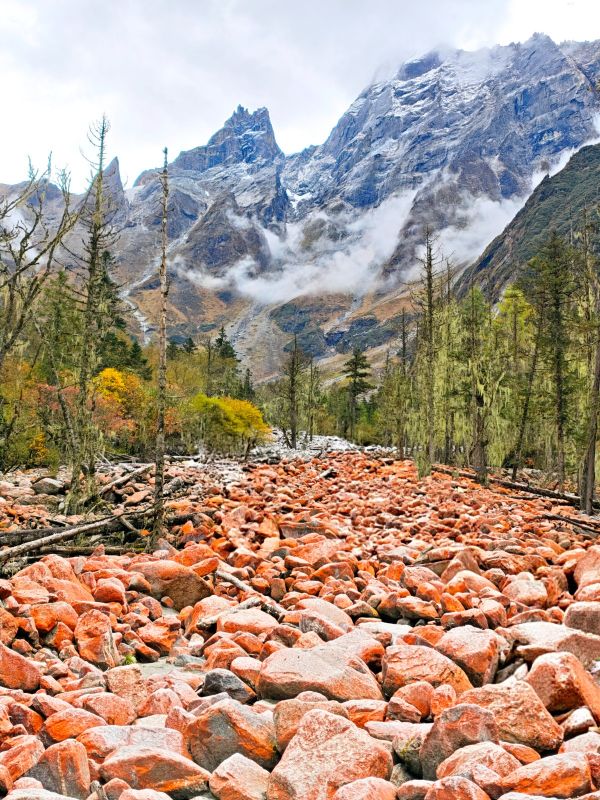 这里是理小路精华景点之一:这里有雪山、森林、草甸、溪流…尤其是规模宏大的红石滩,是除了海螺沟红石滩之外,中国第二大红石滩!!在山谷里绵延一两公里,非常壮观,山地立体型气候,空气污染度为零,属于原始生态景点,关键无门票。跟随领队前往红石滩徒步2公里,近距离感受雪山脚下的红色石滩,在此游玩2个小时,午餐可在此自由觅食,有烧烤,小吃,方便面等,也可以自带,随后继续沿着理小路前行。