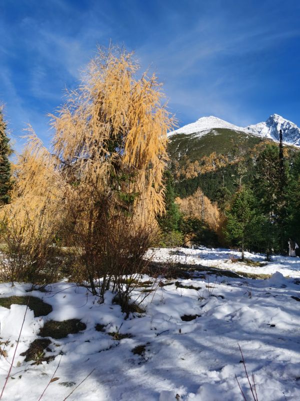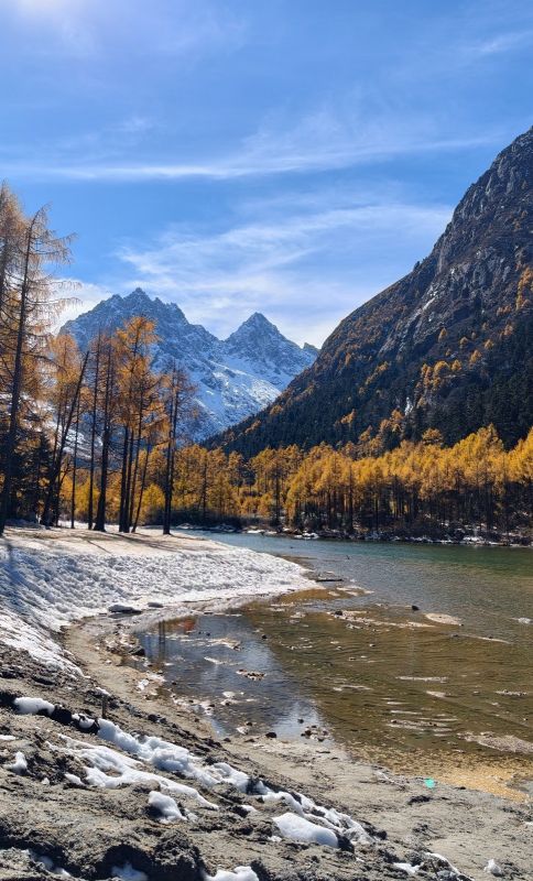毕棚沟的秋天真的像童话的世界,非常的美,雪山彩林海子相互映衬,雪白,金黄,湛蓝。就是毕棚沟秋天的色彩