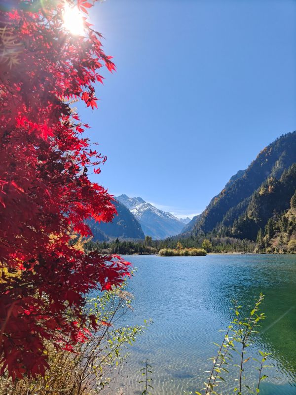深红的叶,碧绿的湖,湛蓝的天,纯白的雪