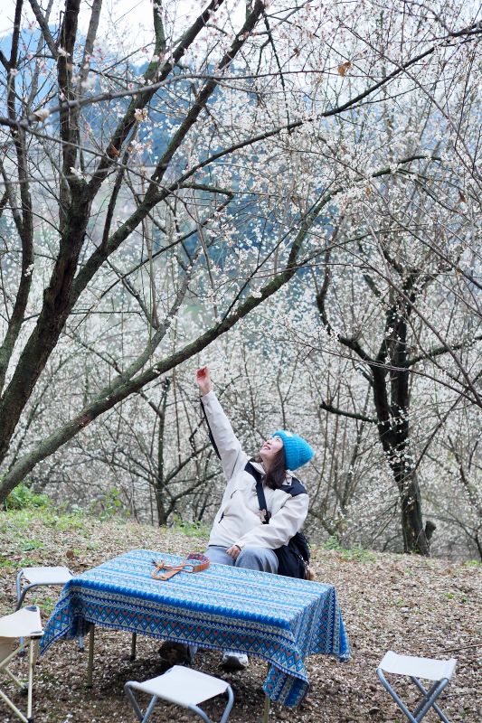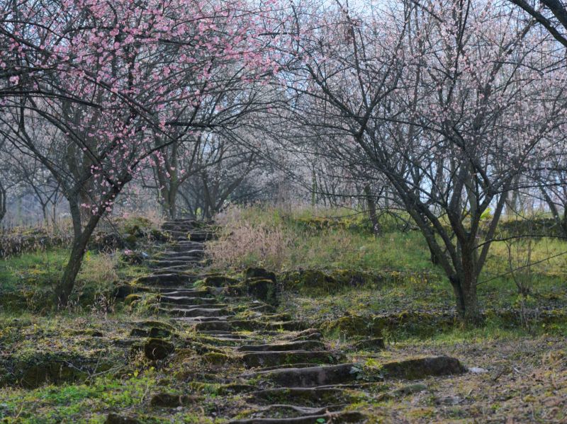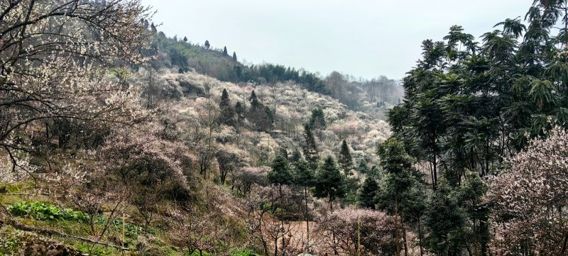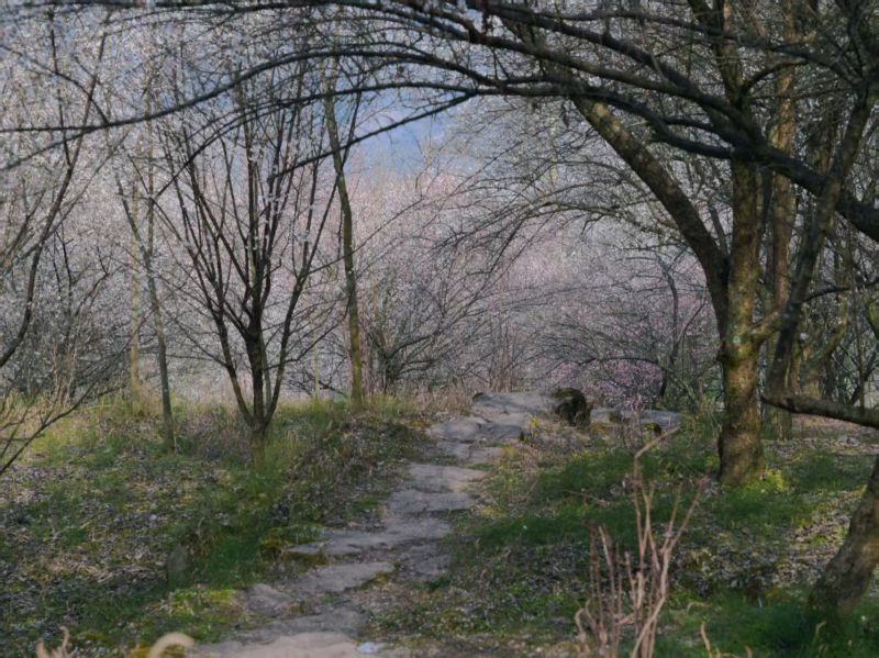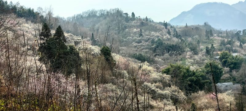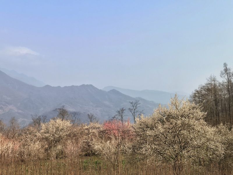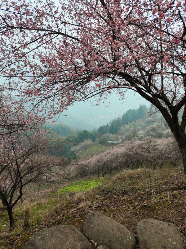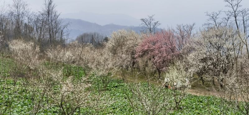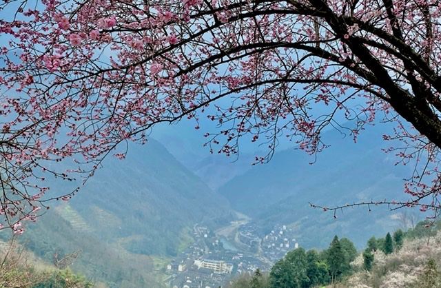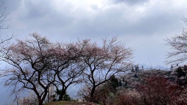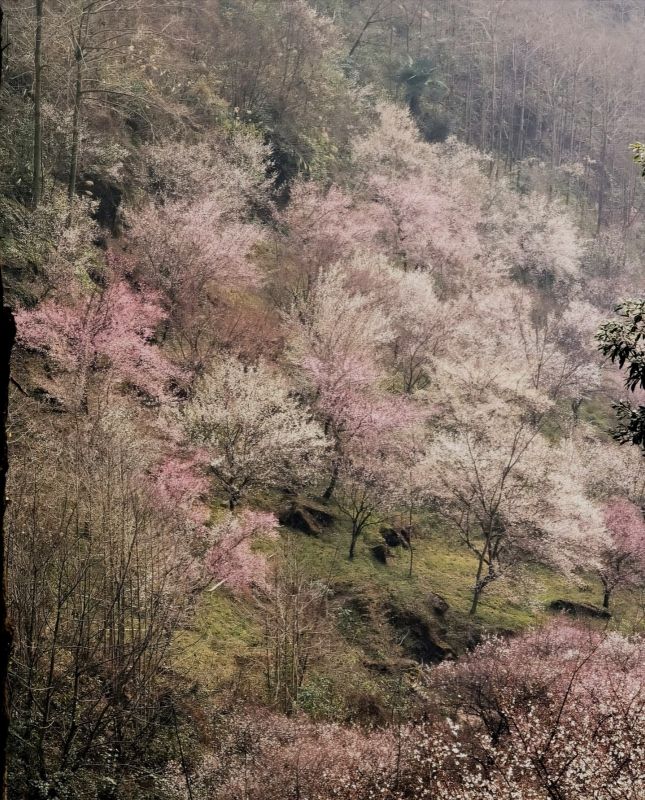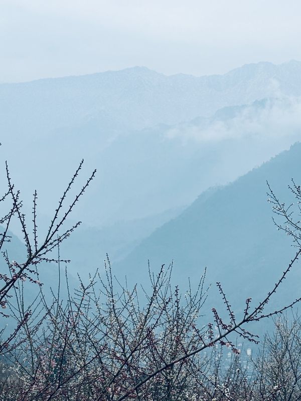 岚影沉空黛,千峰凝雪意。花朵开满枝头,枯枝已萌新绿,层峦隐于流动的云雾间,静谧中透着生机。花已开,赶快来;路有点滑,小心一点。领队很棒,一直帮着拍照。