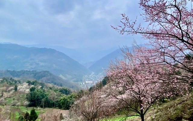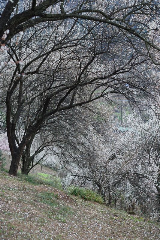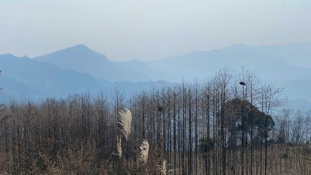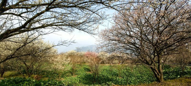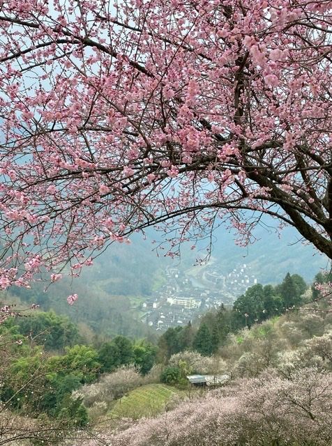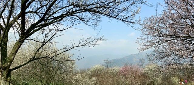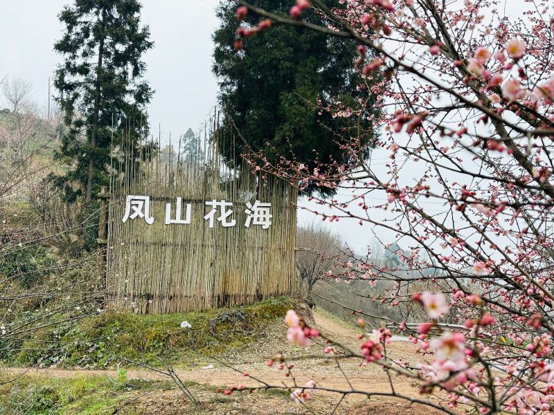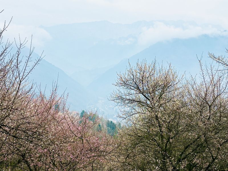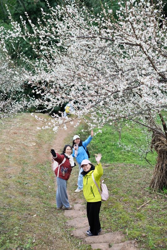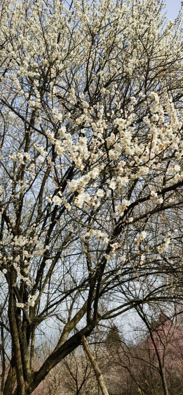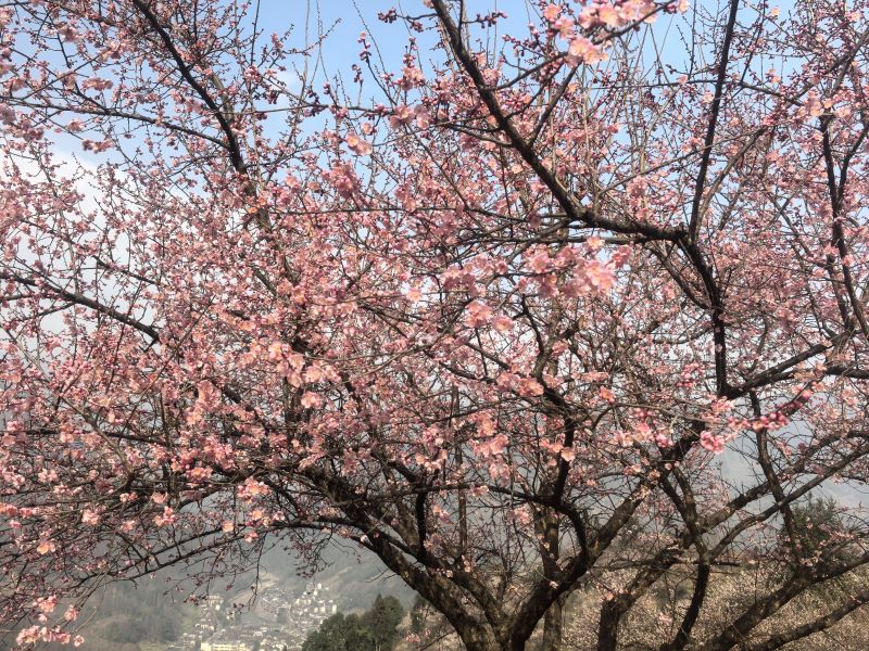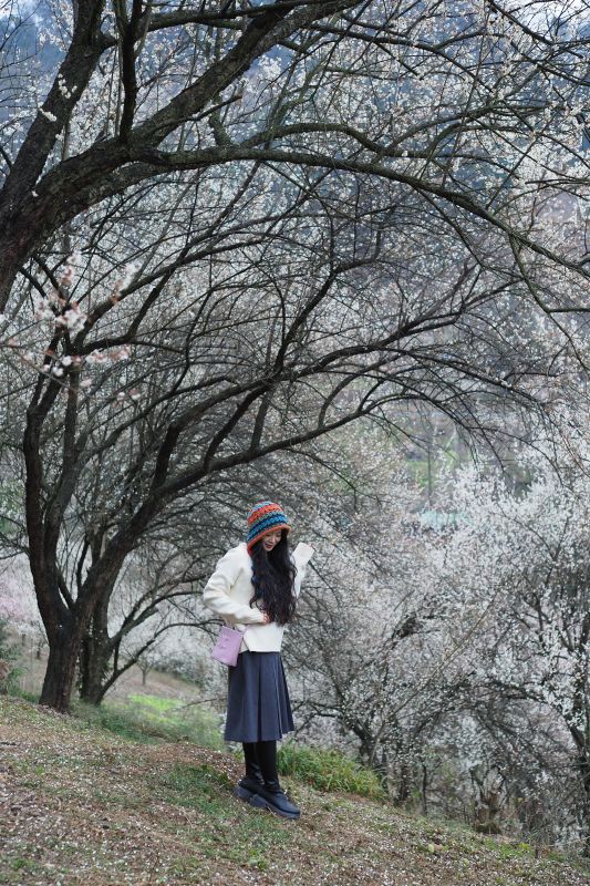 岚影沉空黛,千峰凝雪意。花朵开满枝头,枯枝已萌新绿,层峦隐于流动的云雾间,静谧中透着生机。花已开,赶快来;路有点滑,小心一点。领队很棒,一直帮着拍照。