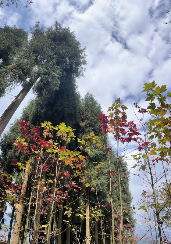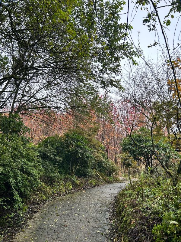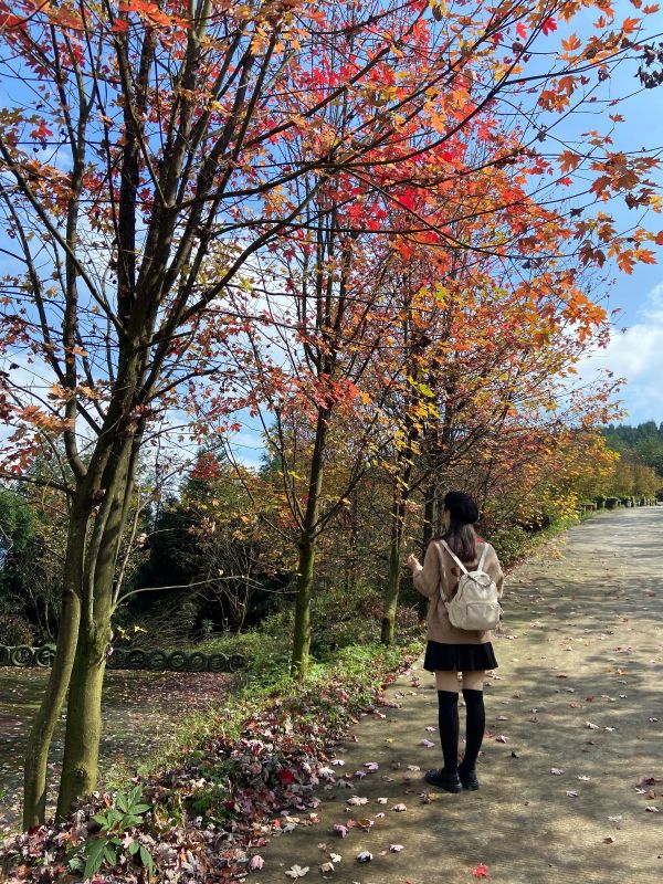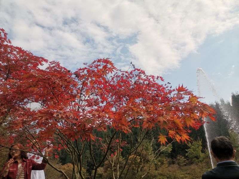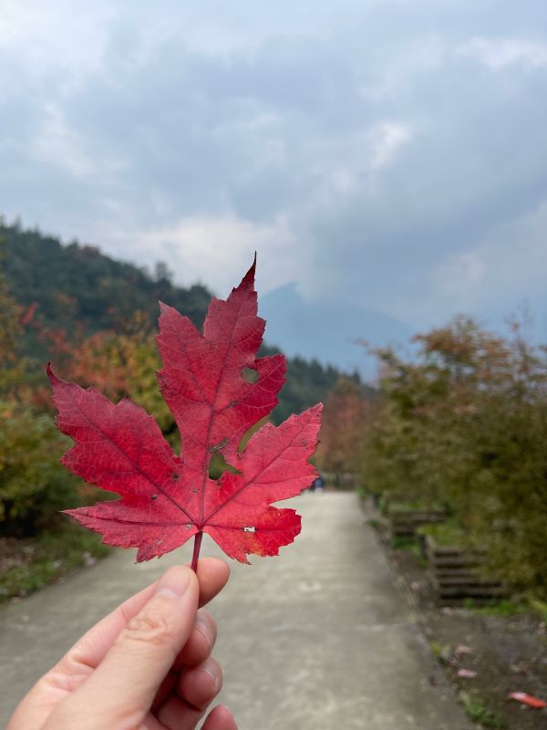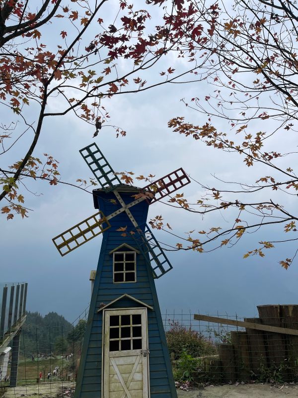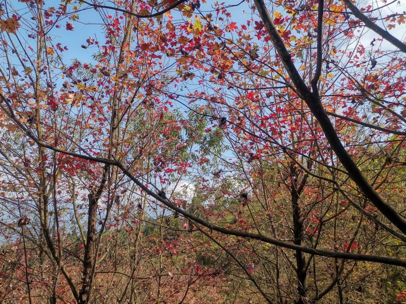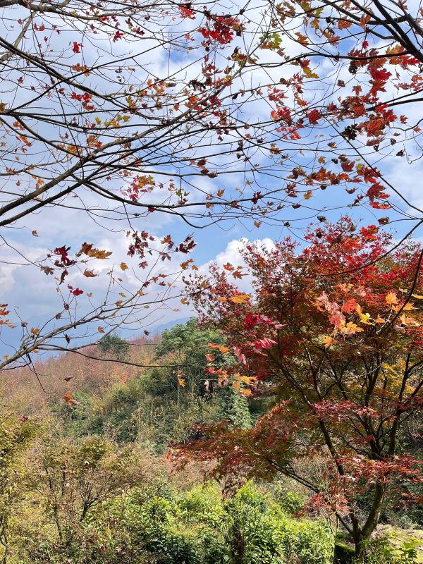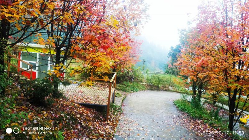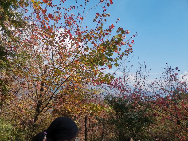 司机师傅把车停在山脚下,我们沿着一条泥巴路爬呀爬爬到了景区门口,进去以后的路都是铺了水泥的,景区不大,10月21号去的时候红枫叶都掉的差不多了,只有山顶上的树还一些叶子。阳光很好,空气很清新,适合慢慢悠悠的拍照、闲逛,景区里面有卖吃的,价格还实惠,不用带太多吃的去。回来的时候是沿着水泥路下山,步行40多分钟就能到山脚,一路上都有车经过,不适合拍照了。