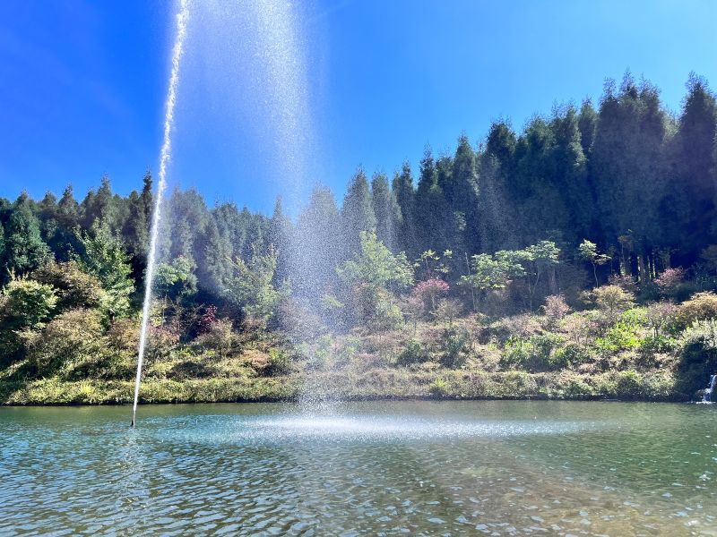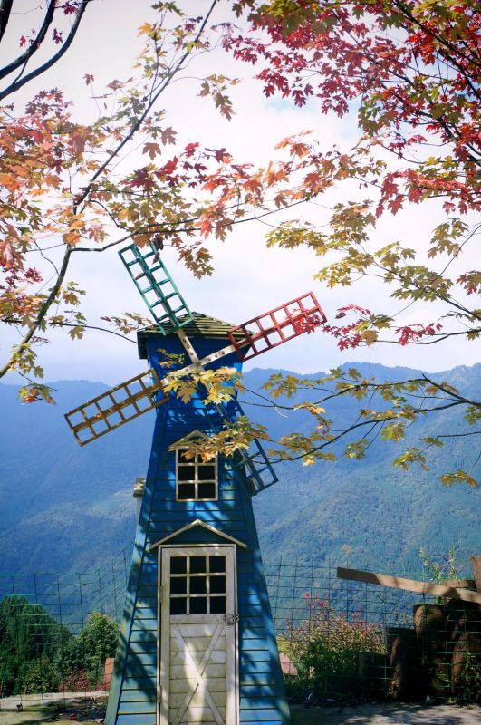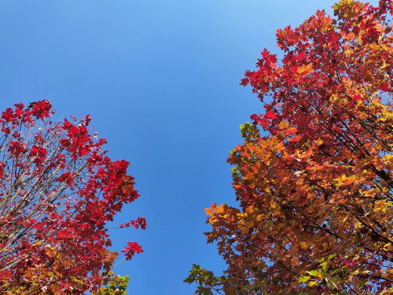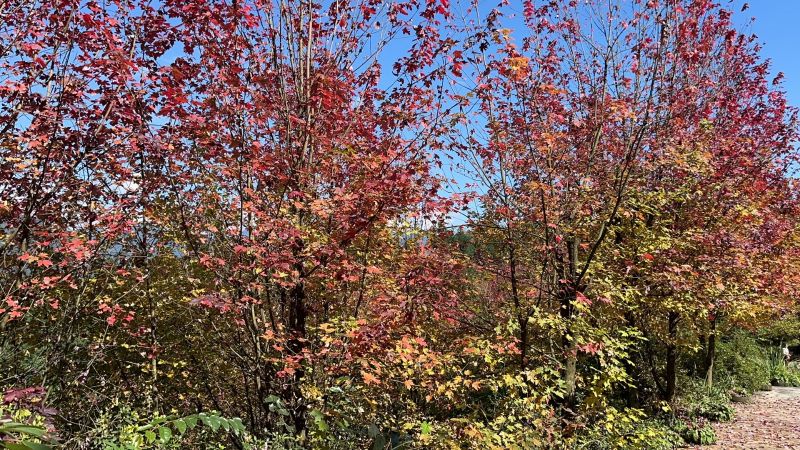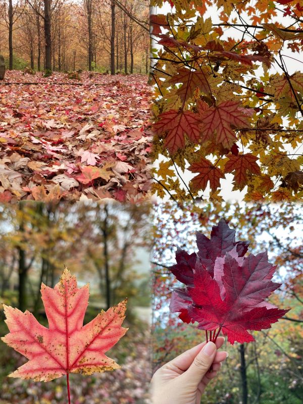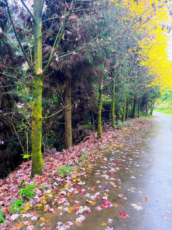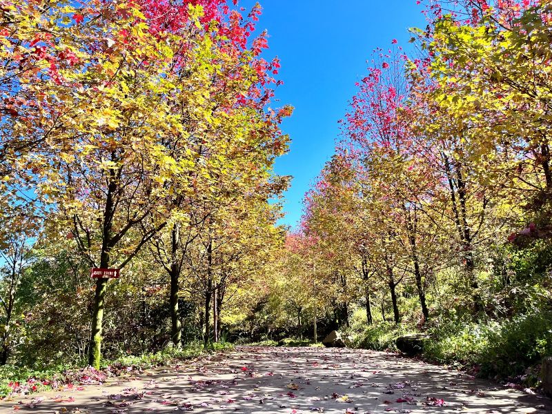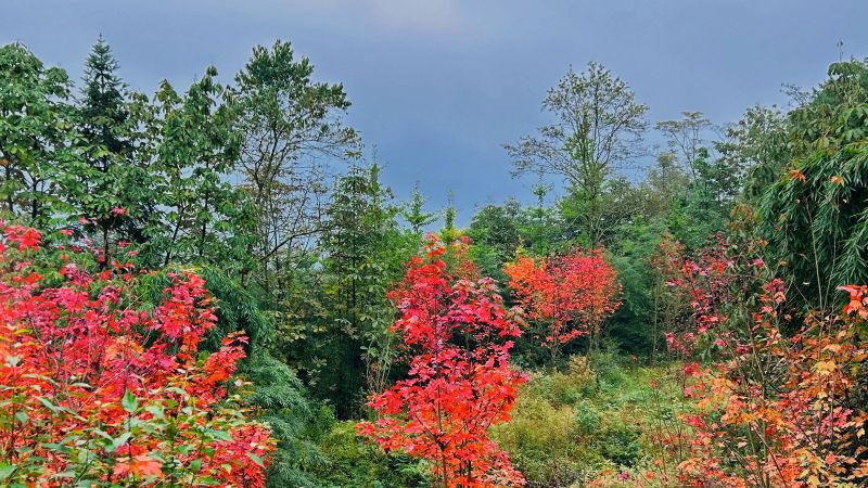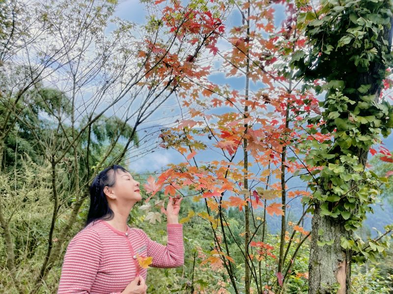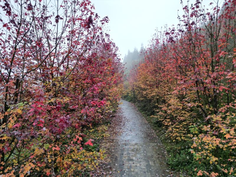 空气清新,负氧离子充沛,遍山绿叶和金黄红枫相簇拥,色彩斑斓而温和。