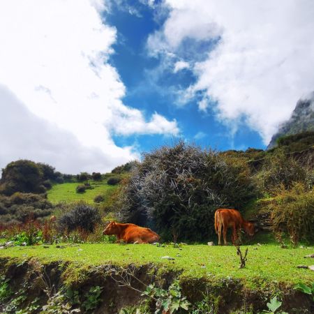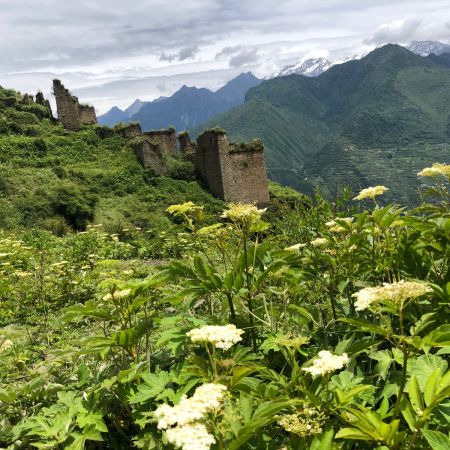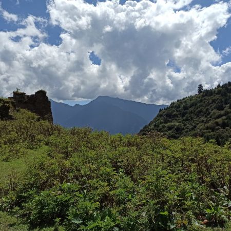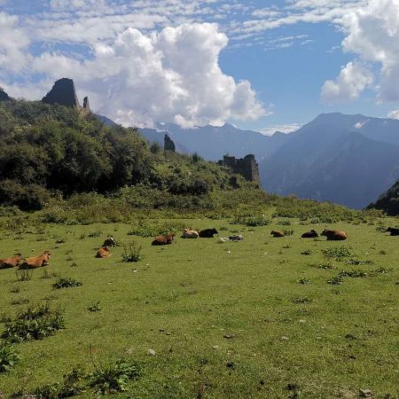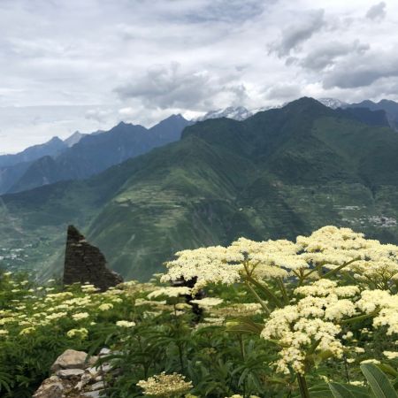 领队八块很幽默风趣。此行很快乐!风景不错,雪山,草甸,牛马,残垣断壁,花花
