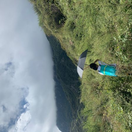 空气清新,蓝天白云很漂亮,不过有段小路很难走,全部都是刺草,全钉脚上了,领队命言很负责,我们走在最后,命言还过来接我们,非常感谢。