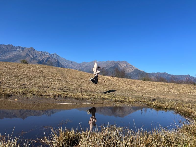 阴时烟雾缭绕,似炊烟在山野里缓缓升起,晴时自然拉近了我们与蓝天的距离,牛羊闲散地吃草,海子像一个微缩景观,拍倒影、拍草地,可以尽情玩耍。