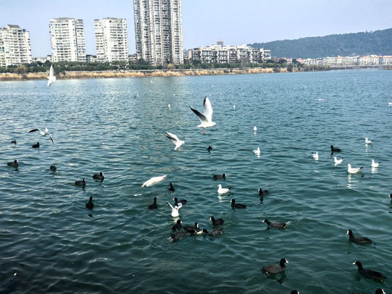 岸边成群结队的不止红嘴鸥