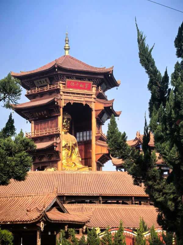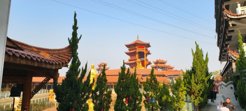 两侧的万佛圣城、千佛殿、罗汉堂、巨大的卧佛、钟鼓楼等,及新落成的灵鹫山蔚为壮观;