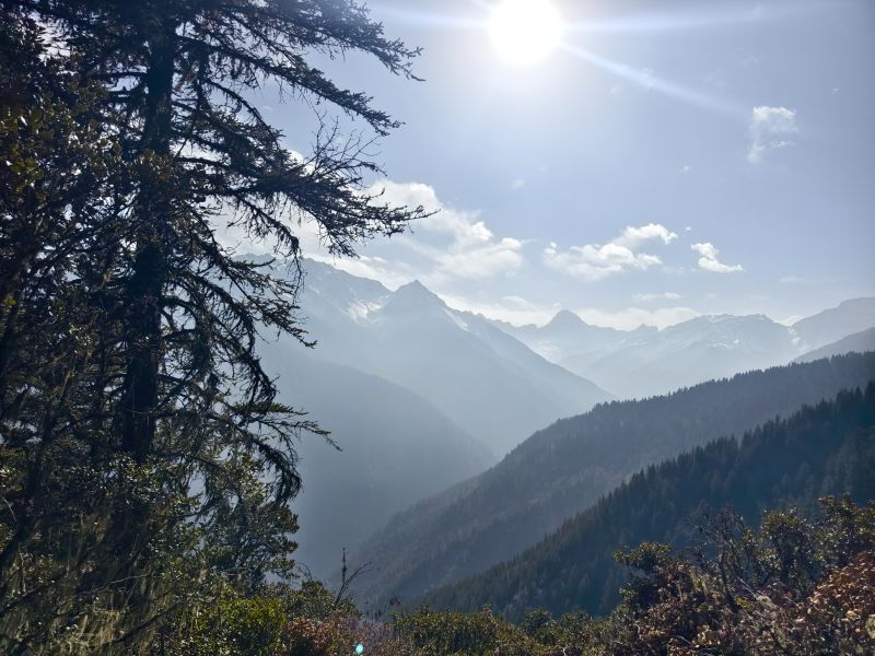 穿过松萝密布的原始森林,到达斯博迪高山牧场,成群的牛羊、远处的雪山,构成一幅绝美和谐的画面。