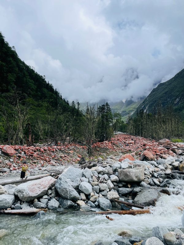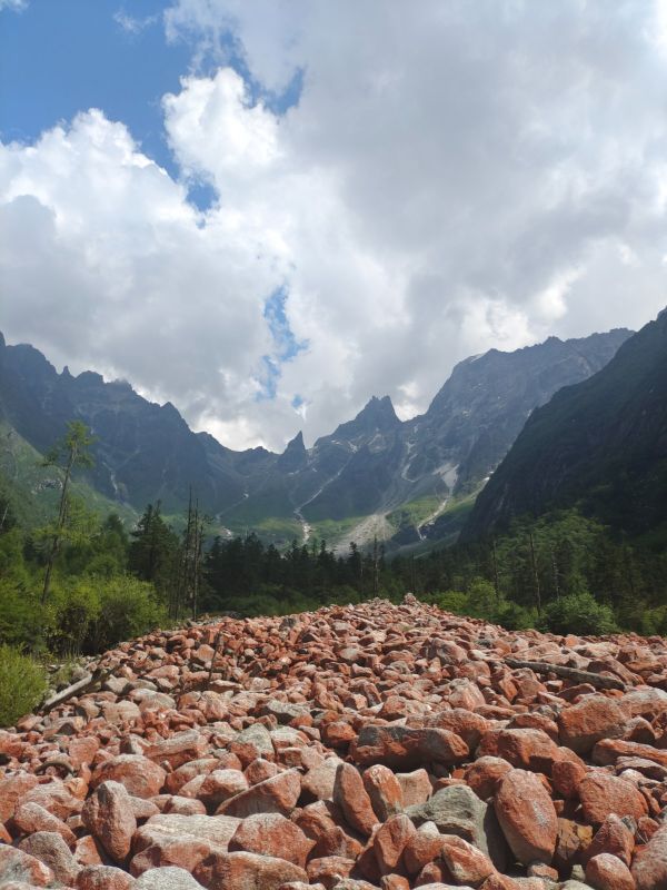 这里是理小路精华景点之一:这里有雪山、森林、草甸、溪流…尤其是规模宏大的红石滩,是除了海螺沟红石滩之外,中国第二大红石滩!!在山谷里绵延一两公里,非常壮观,山地立体型气候,空气污染度为零,属于原始生态景点,关键无门票。跟随领队前往红石滩徒步2公里,近距离感受雪山脚下的红色石滩,在此游玩2个小时,午餐可在此自由觅食,有烧烤,小吃,方便面等,也可以自带,随后继续沿着理小路前行。