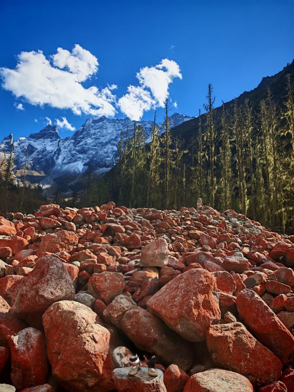 【红石滩】在大二普游玩结束后,我们继续乘车前往凉台沟/红石滩,这里有雪山、森林、草甸、溪流…尤其是规模宏大的红石滩,是除了海螺沟红石滩之外,中国第二大红石滩!!在山谷里绵延一两公里,非常壮观,山地立体型气候,空气污染度为零,属于原始生态景点,关键无门票。跟随领队前往红石滩徒步2公里,近距离感受雪山脚下的红色石滩,在此游玩2个小时。