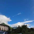 穿过最后一段树林,迎面一片宽阔的草场,雪山浮现视野。