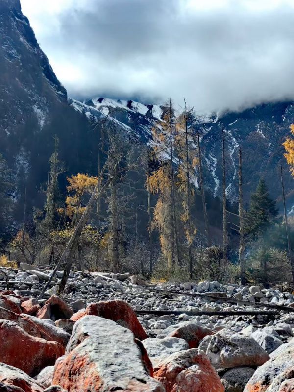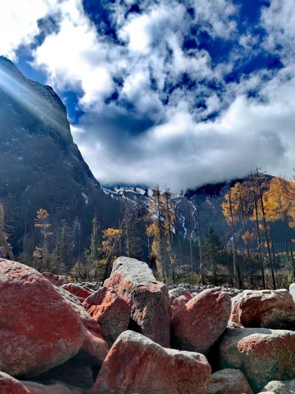 【红石滩】在大二普游玩结束后,我们继续乘车前往凉台沟/红石滩,这里有雪山、森林、草甸、溪流…尤其是规模宏大的红石滩,是除了海螺沟红石滩之外,中国第二大红石滩!!在山谷里绵延一两公里,非常壮观,山地立体型气候,空气污染度为零,属于原始生态景点,关键无门票。跟随领队前往红石滩徒步2公里,近距离感受雪山脚下的红色石滩,在此游玩2个小时。