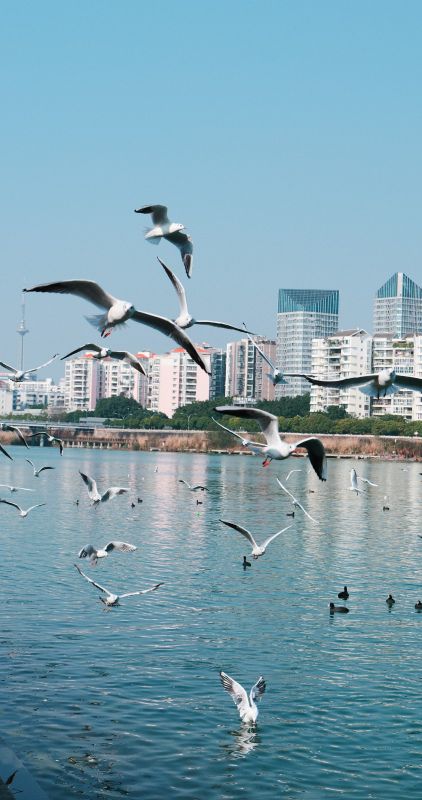 时而飞向人群觅食嬉戏