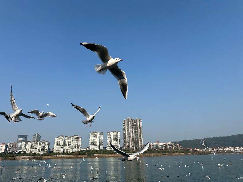 红嘴鸥们时而在江面嬉戏转圈