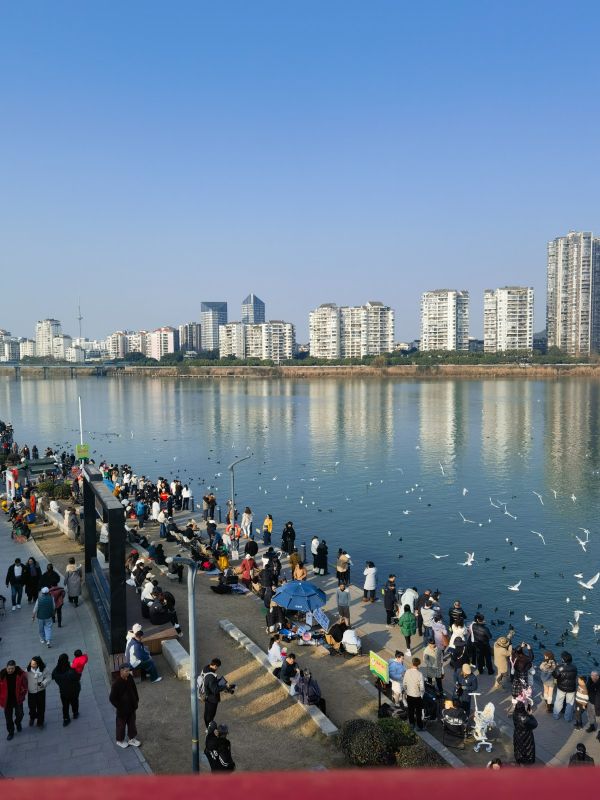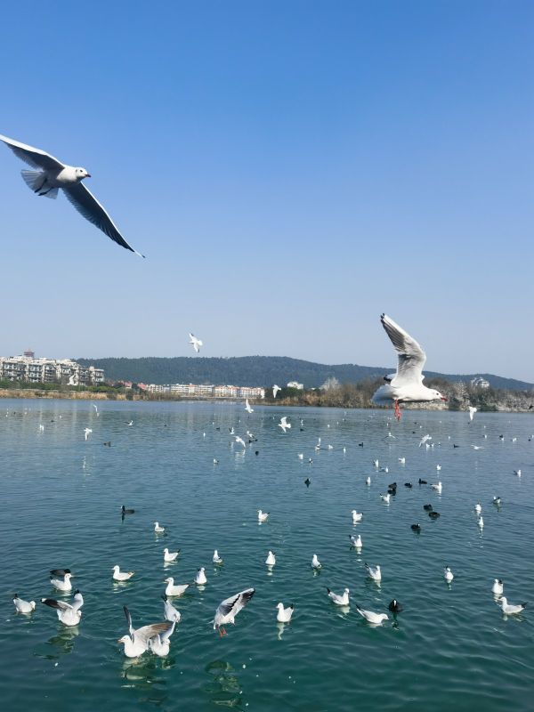 岸边成群结队的不止红嘴鸥