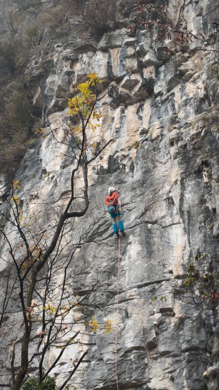 当下山途中,涪江河上的清风穿过扑面而来,总会不自觉地放慢脚步,去感受一种发自内心的平静。下山的最后会进入2km左右的机耕道, 路线沿崖壁延伸,部分路段较窄,但整体平缓,适合有一定徒步经验的人。上面的岩壁上仍能看到当年开凿的痕迹,以及攀岩者留下的岩钉。