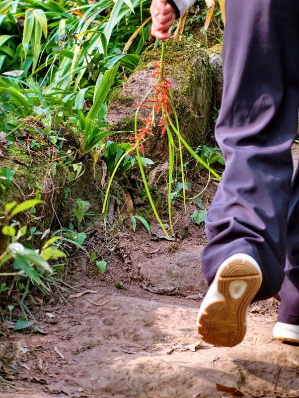 穿过竹林,山路逐渐显露其“野”性的一面。道路时而平缓,时而陡峭,需要我们手脚并用,真正体验“爬山”的乐趣。沿途是茂密的灌木与不知名的野花,脚下的落叶沙沙作响。这纯粹的土路,比任何人工步道都更能连接我们与自然的距离。