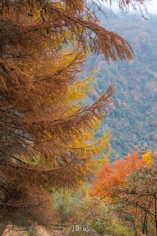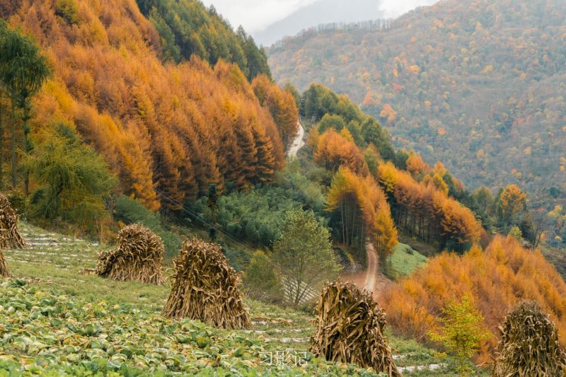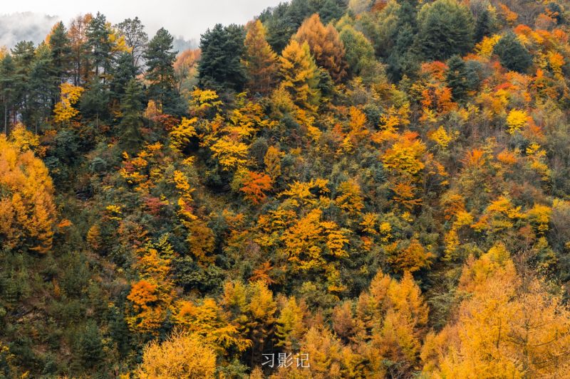 卧龙老鸦山位于耿达乡境内,老鸦山秋季以黄杉为主,登上空旷之地一眼望去,漫山黄杉尽收眼底,与山下的绿色有着清晰的分界线,带来强烈的视觉效果。