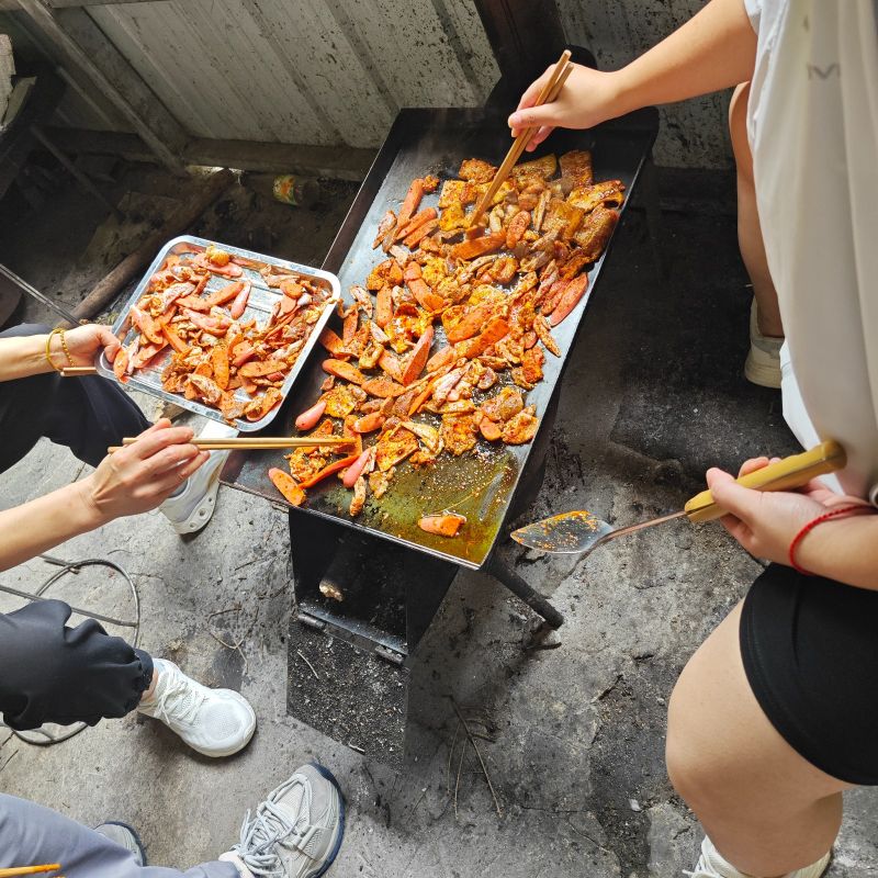 这里除了瀑布、溪流、森林、牛羊,还有当地的特色铁板烧,看那炸得金黄的肉,亮透诱人,一看就很有食欲。吃多了都市里的食物,偶尔来尝尝这种野外美食,也是一种难忘的体验呢。