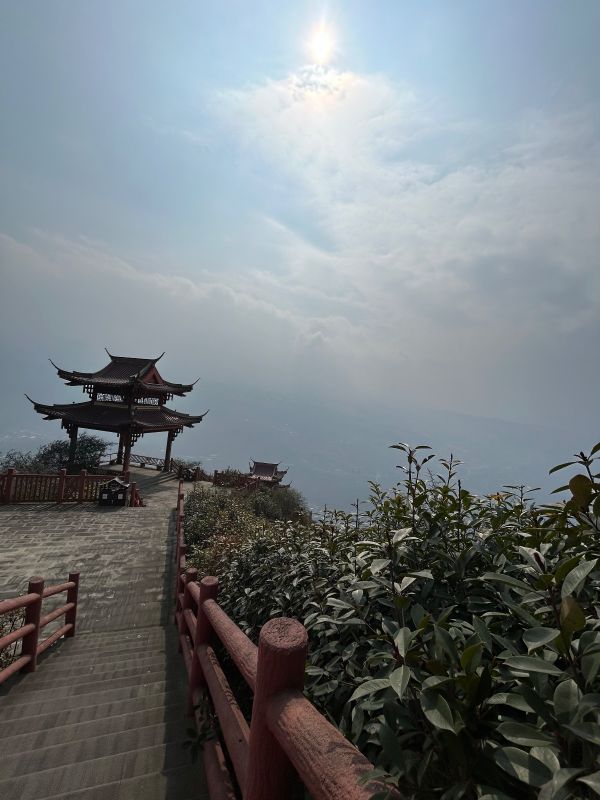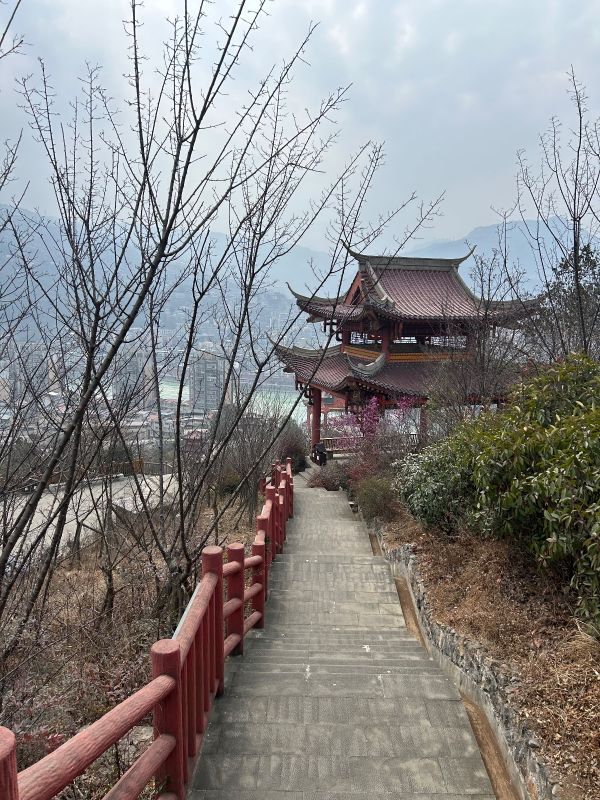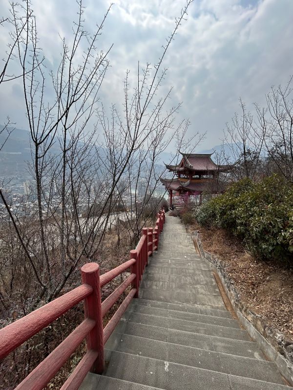 天气的雾有点大,主要是楼梯,有些伙伴爬的比较快,一个多小时就登顶了,下山时间比较早,跟着领队去逛了一圈街