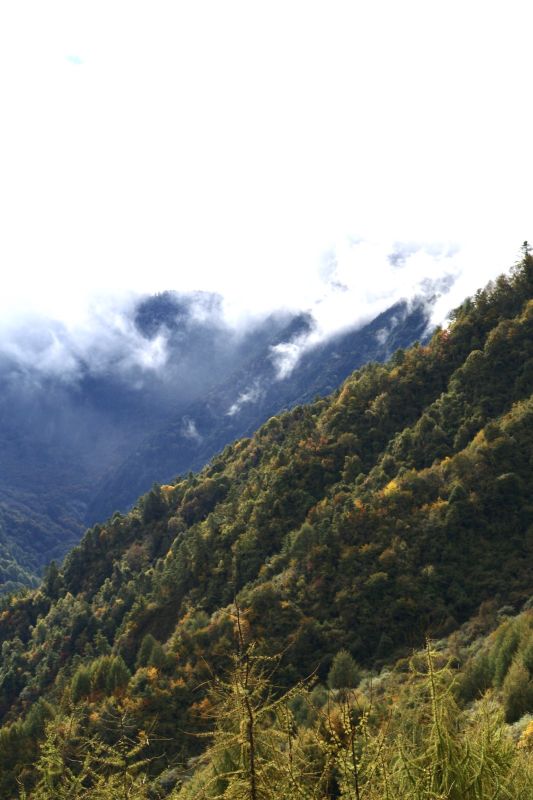 透过嫩绿的草叶儿依然能预见它碧空如洗的静美,草丛中点缀着各色草甸小野花,在春风中娇小且倔强。风徐徐而来,远处的雪山渐渐显露身姿,层层绿色在缥缈的云雾中忽明忽暗,云雾从山涧升腾而起或从山尖倾泻散漫开来,宛如仙境,美到窒息。