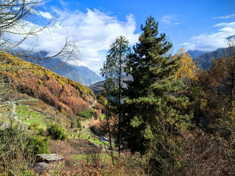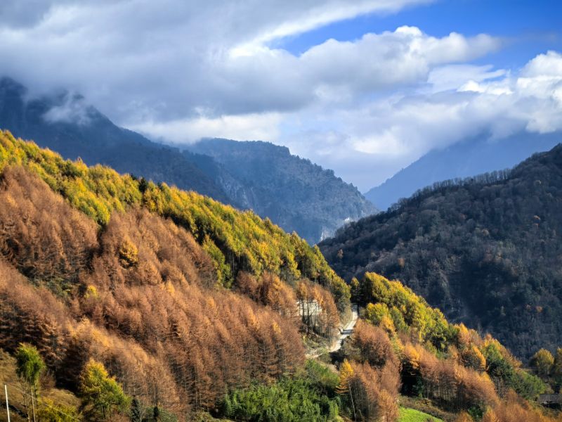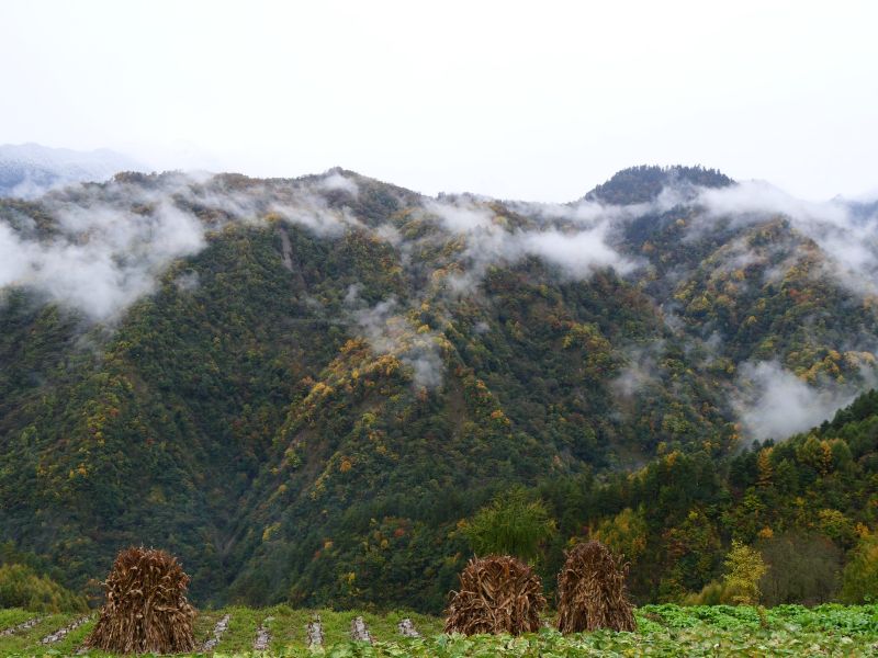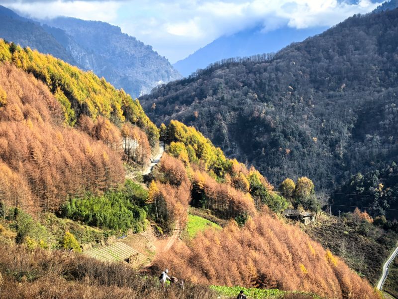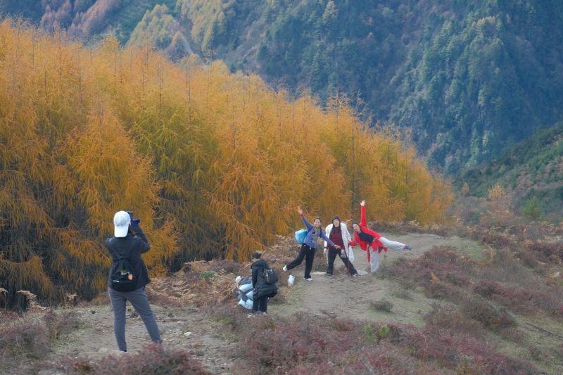 卧龙老鸦山位于耿达乡境内,老鸦山秋季以黄杉为主,登上空旷之地一眼望去,漫山黄杉尽收眼底,与山下的绿色有着清晰的分界线,带来强烈的视觉效果。