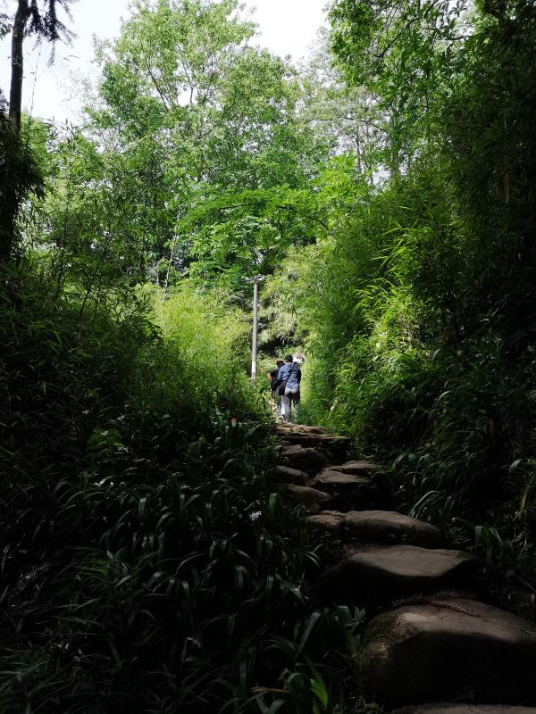登上山顶,两条小径分左右而行,一边是丛生的原始森林,一边是葱郁的楠竹林,偶有群鸟飞过,叽叽喳喳的,显得幽静而生态。