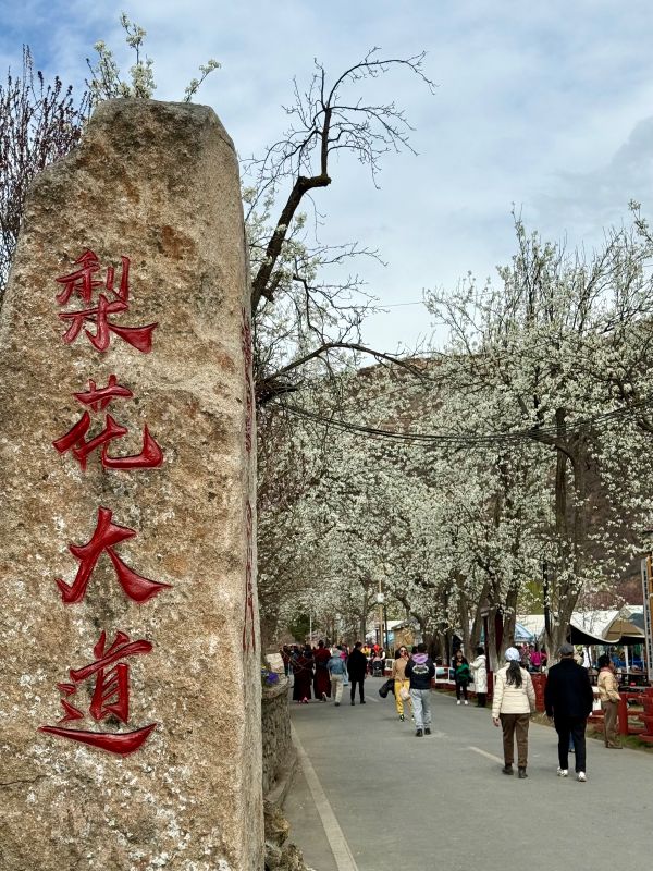 午餐后,在领队的带领下,观赏到初春梨花等争相开放,与绿油油麦田相互映衬,一路边走边拍,开始各种大片和抖音创作,沿河两岸的梨花的大片,大多处于这里;