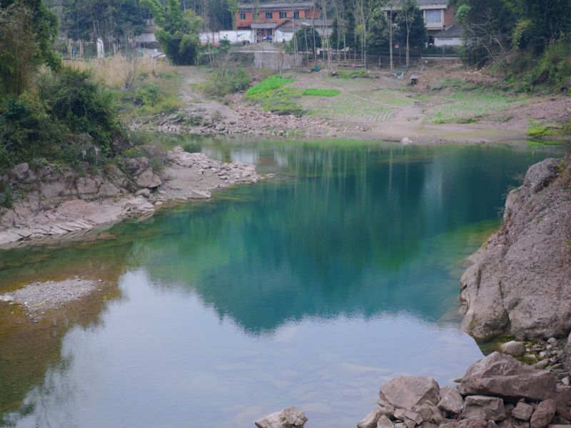 位于药师岩下方的䢺江河,从西岭雪山以及周边山体汇集自此,河水不深不湍急却异常清澈,鱼虾可见,到了夏天,戏水撒欢的绝佳宝地。