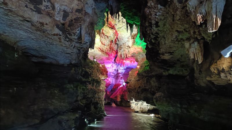 地下河谷,石壁造型多纹路美艳,河水碧绿深幽,仿佛世间最伟大的艺术臻品。洞内还有盲鱼、野生娃娃鱼等罕见的洞穴生物。