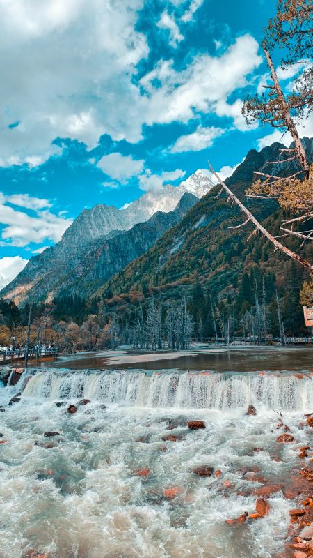 当天地之间一片雪白,清澈的水流叮咚作响,水中的枯木摇曳生姿,简直就是浑然天成的艺术品。