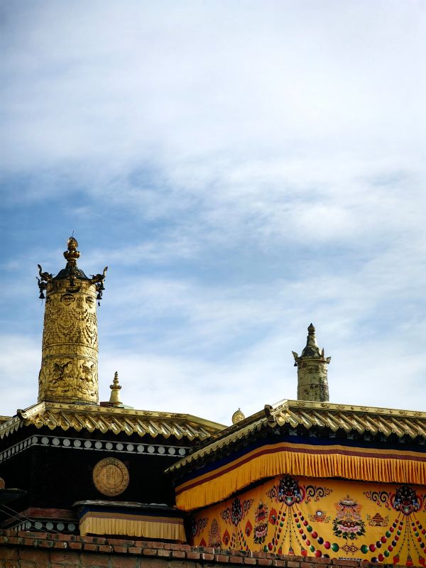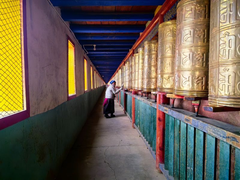 沿着长长的转经廊长廊走过,顺时针转过每一个装有活佛净点过的经书、圣物的转经筒,便可以感受当地信徒虔诚向佛、一心行善、祈祷平安浓郁的宗教氛围。