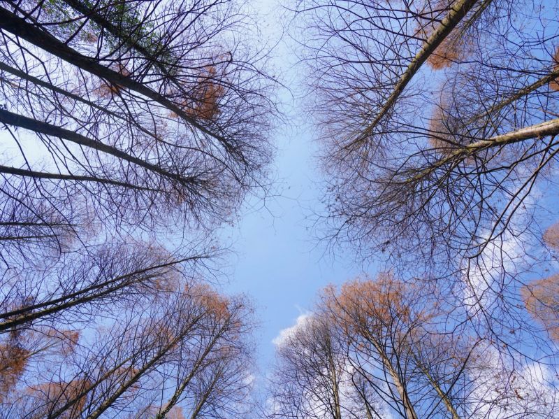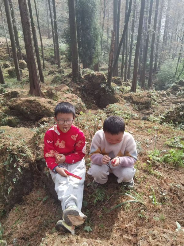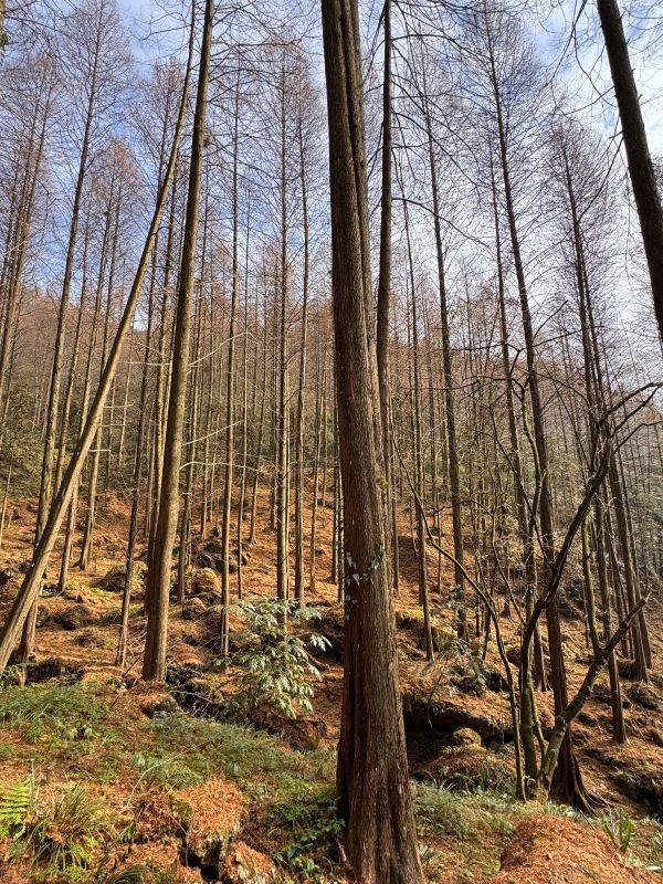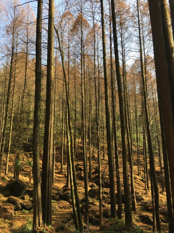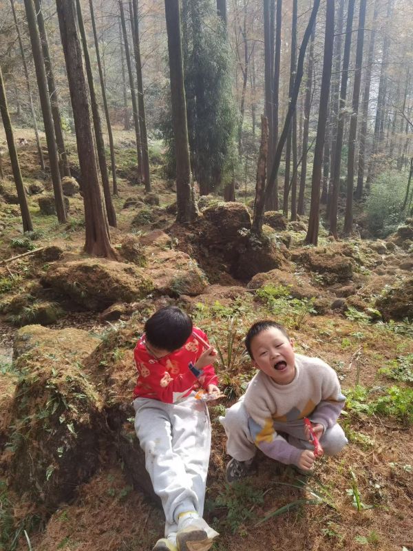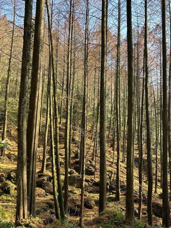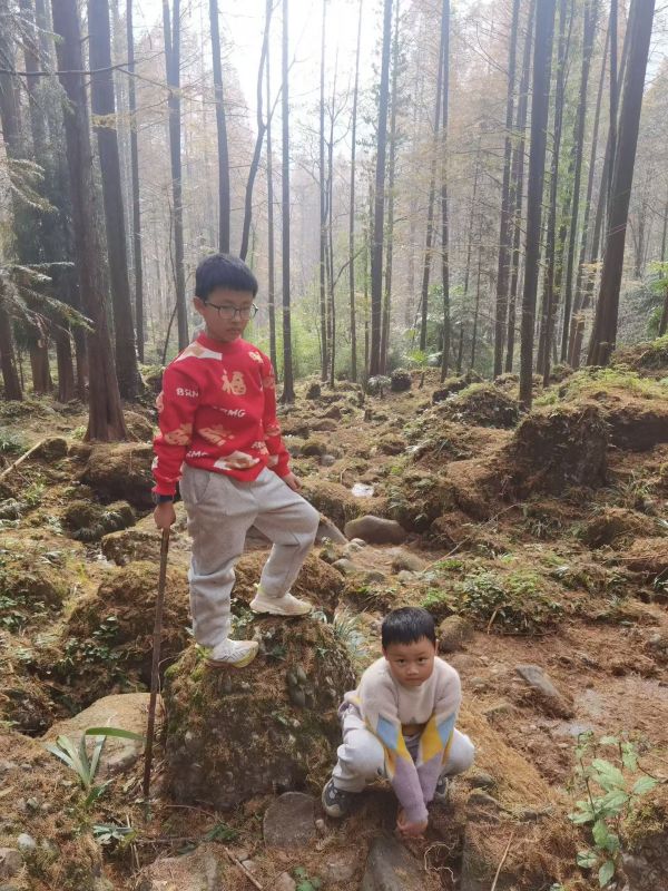 今天天气很好,太阳暖暖的,路有点远,我家小鬼走不动了,连哄带骗哄上去,山顶杉树林很漂亮,味道也很好闻,很喜欢
