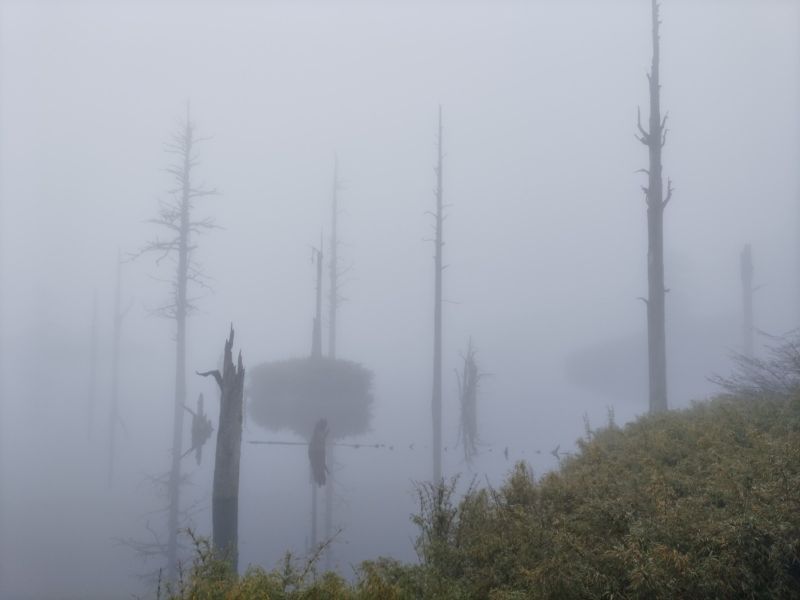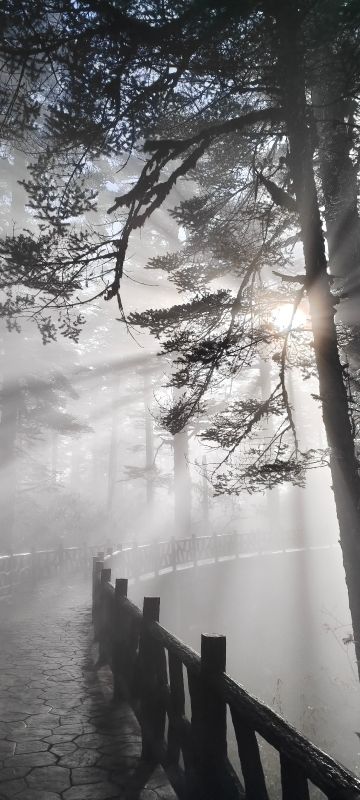 一开始是这样的,后面就是这样的。(看图片先后次序) 以为大雾弥漫,能见度50米也就这样了,最后意外的惊喜!阳光冲破云层,暖意渐浓,凉意溜走。果然好景都是留给勇于攀登的人 !