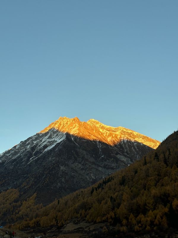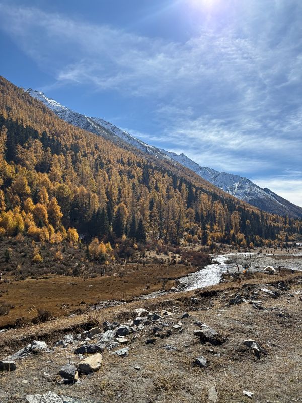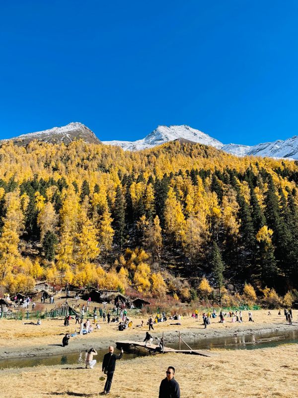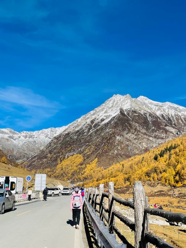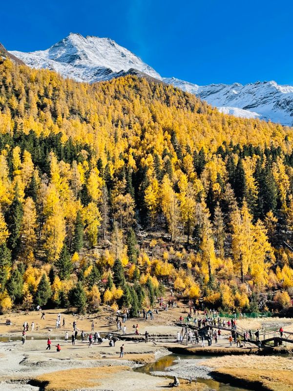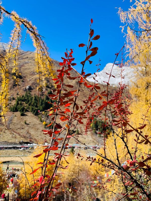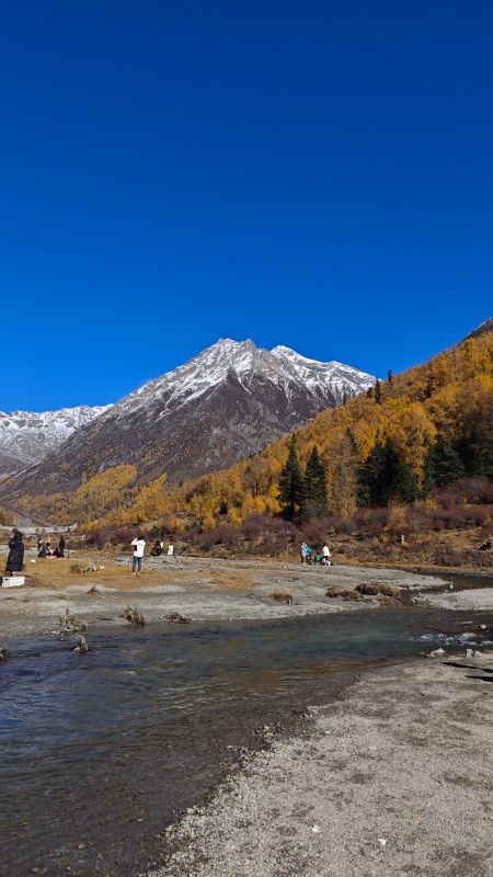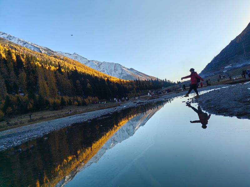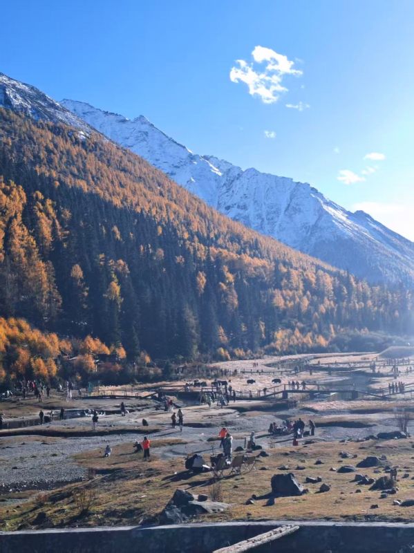 雪山,蓝天,白云,彩林,浅滩,光是这些词语的堆砌就已经是美得不可方物的秋天了,更不要说路上看到雪山顶的风吹雪,五彩祥云,日落时分的光影饕餮,日照金山,要说不完美,那就是堵车实在是太堵了,但是换个角度,就像是好馆子永远要排队一样,景点一年当中的盛世美颜也只有那短短的一段时间,大家都想来看看,好的领队,好的司机,好的驴友,完美的一天