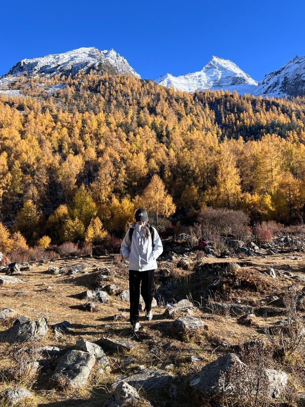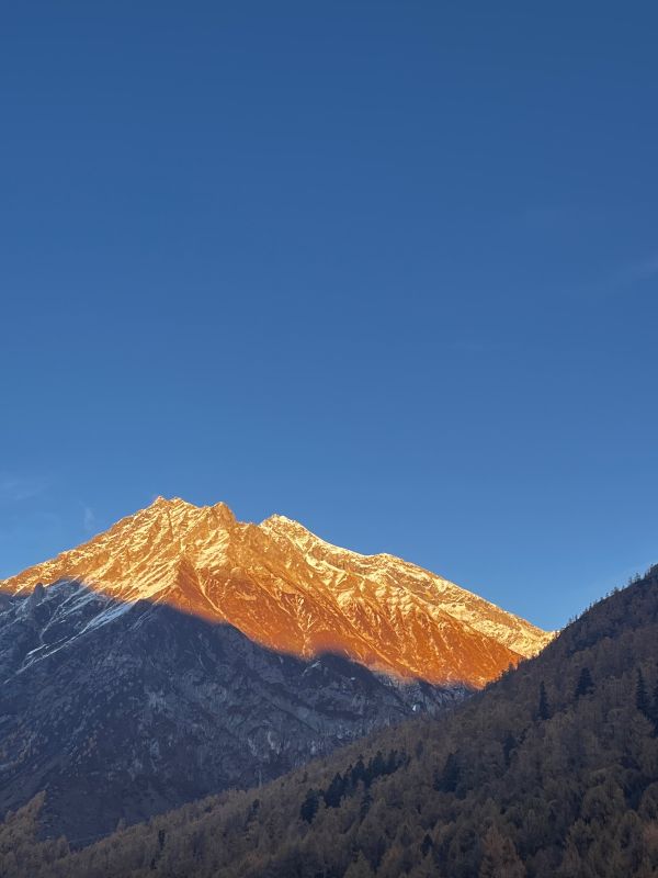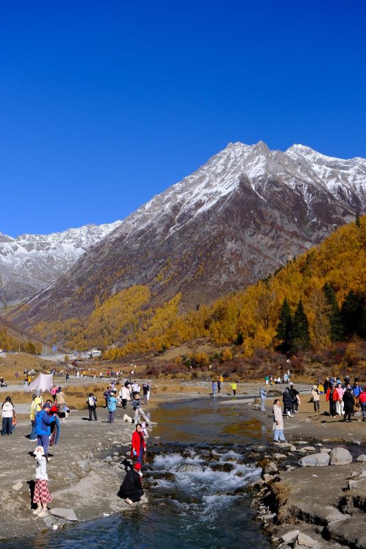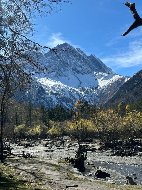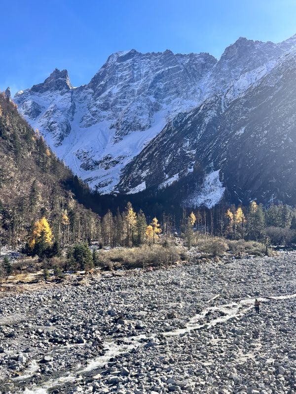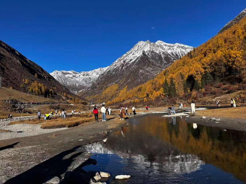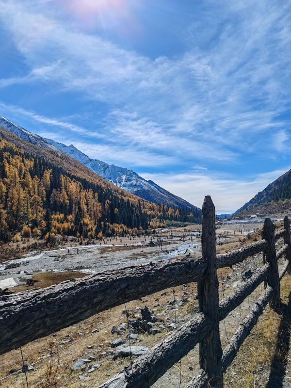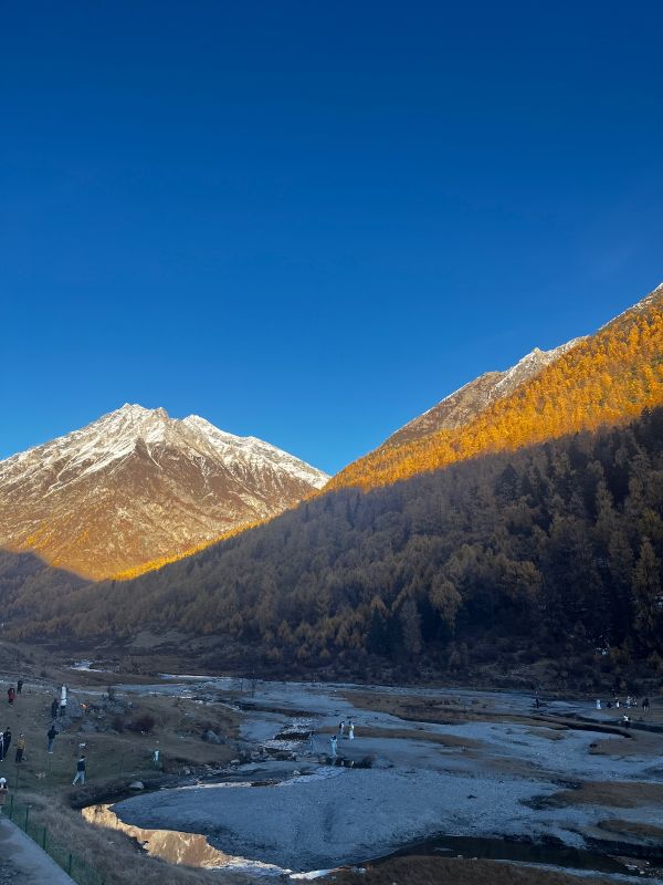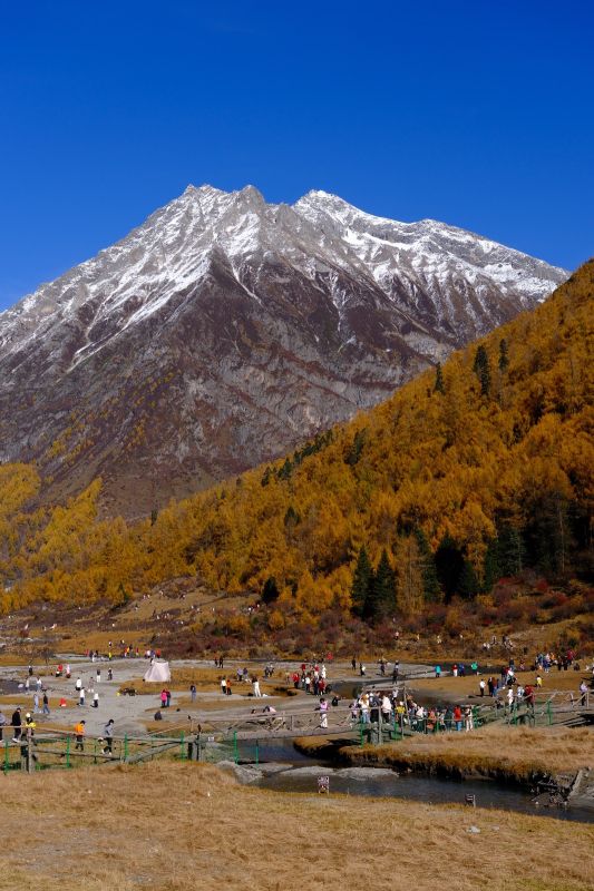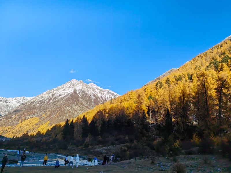 雪山,蓝天,白云,彩林,浅滩,光是这些词语的堆砌就已经是美得不可方物的秋天了,更不要说路上看到雪山顶的风吹雪,五彩祥云,日落时分的光影饕餮,日照金山,要说不完美,那就是堵车实在是太堵了,但是换个角度,就像是好馆子永远要排队一样,景点一年当中的盛世美颜也只有那短短的一段时间,大家都想来看看,好的领队,好的司机,好的驴友,完美的一天