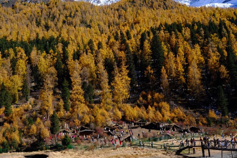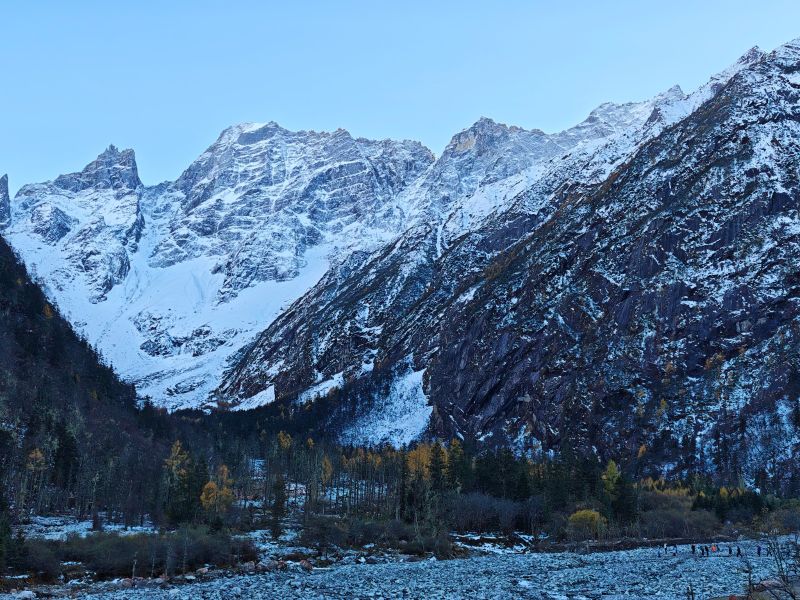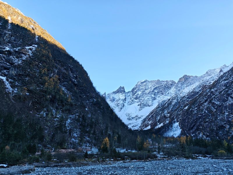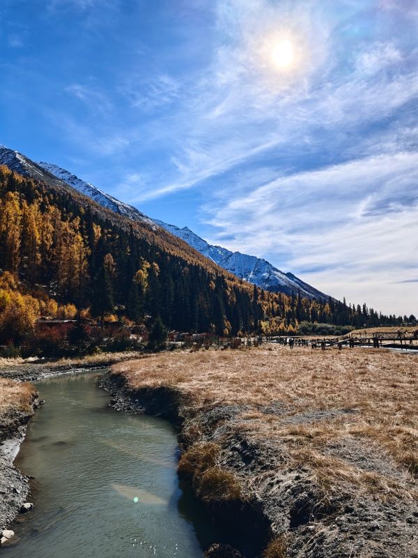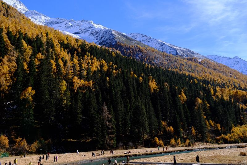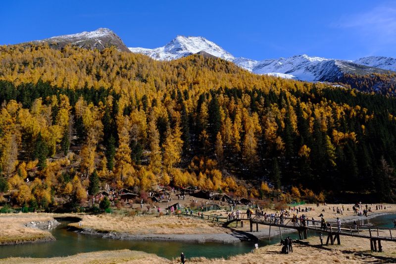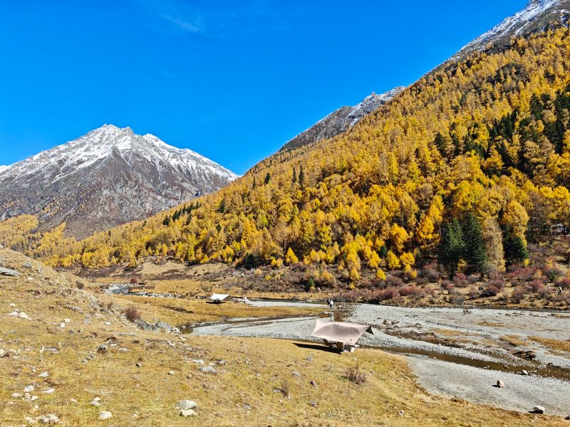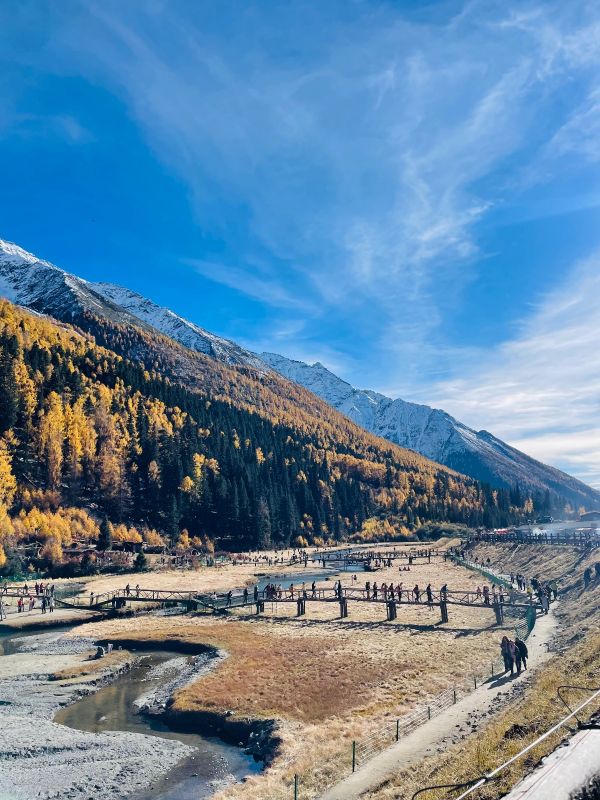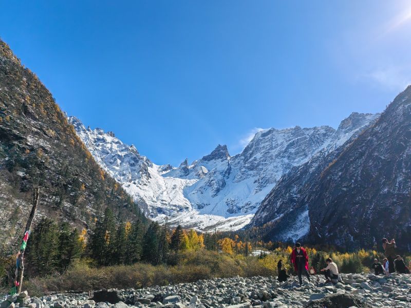 雪山,蓝天,白云,彩林,浅滩,光是这些词语的堆砌就已经是美得不可方物的秋天了,更不要说路上看到雪山顶的风吹雪,五彩祥云,日落时分的光影饕餮,日照金山,要说不完美,那就是堵车实在是太堵了,但是换个角度,就像是好馆子永远要排队一样,景点一年当中的盛世美颜也只有那短短的一段时间,大家都想来看看,好的领队,好的司机,好的驴友,完美的一天