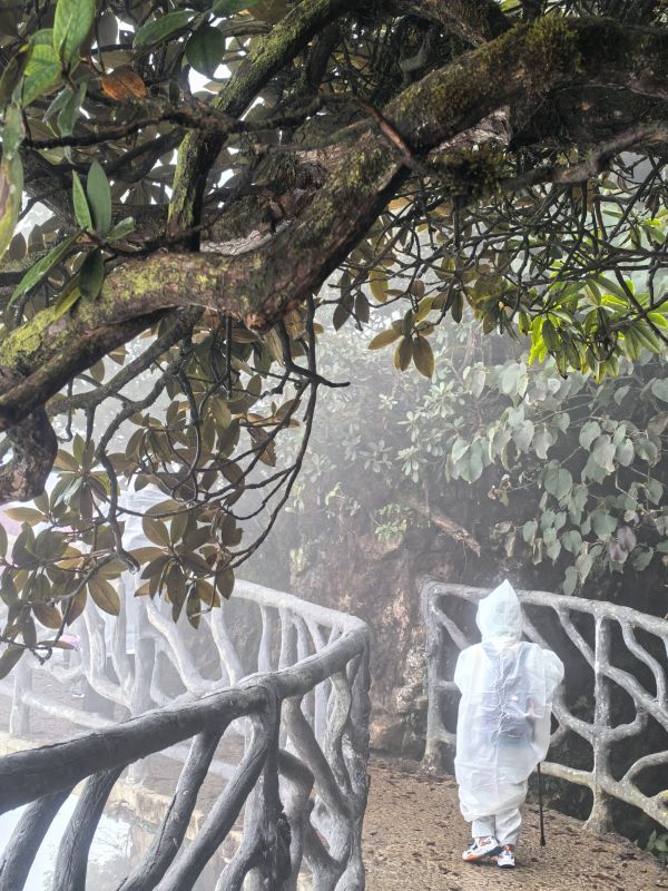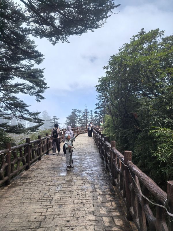 下雨雾太大,偶有云开的时候,还看到了小熊猫和松鼠,小松鼠是真不怕人啊,现在的动物被保护的很好,感觉它再进化一下会不会也敢像猴子一样过来抢吃的了,下次再去的时候希望天气好,流程上即使坐缆车下到索道站也要走很久,领导小月很有爱心还帮忙拍照,