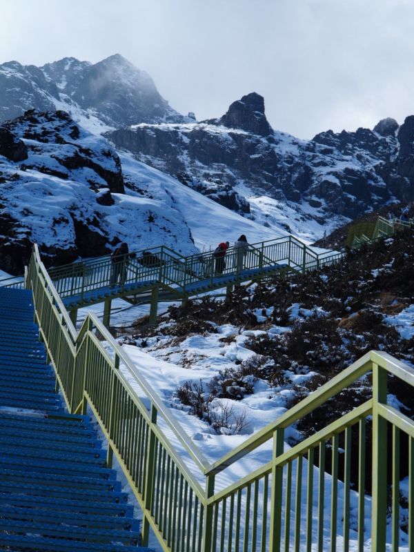 猴子非常顽皮,山顶雪很厚,领队认真负责。