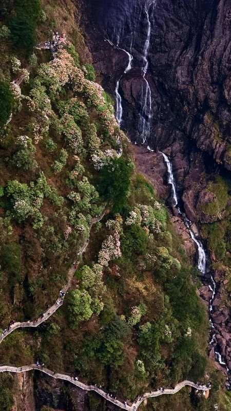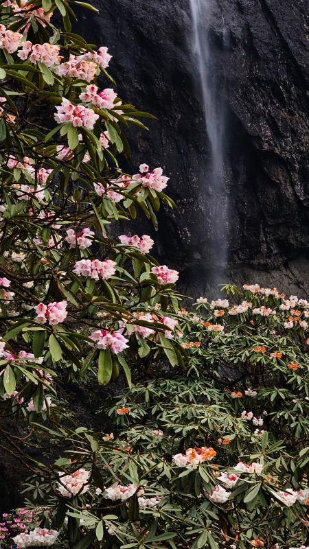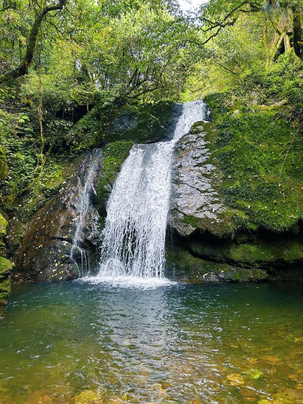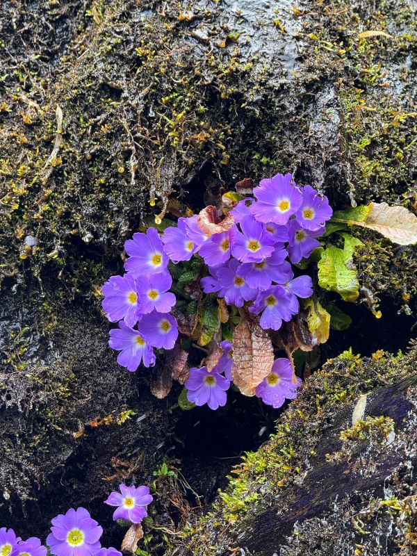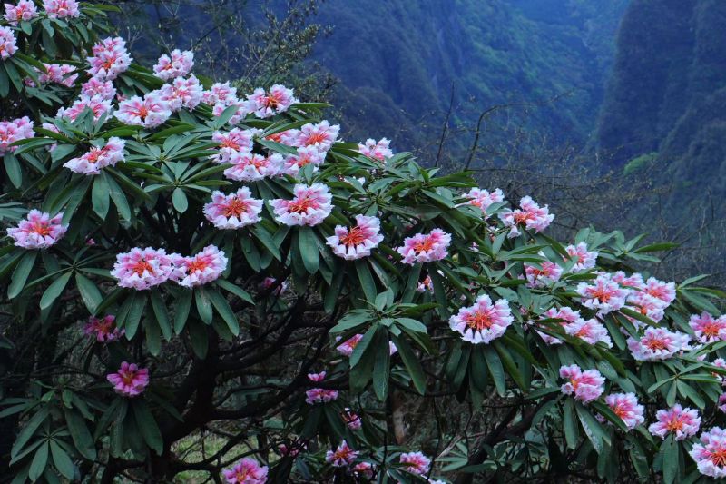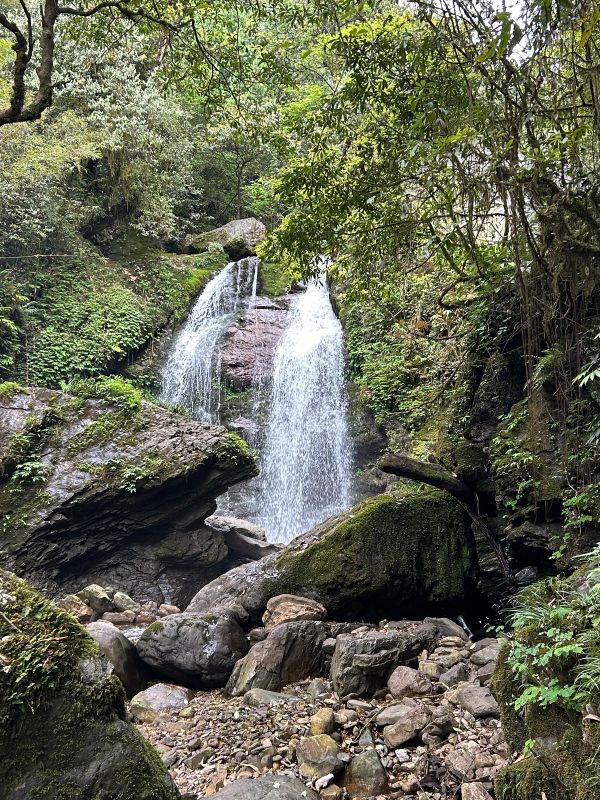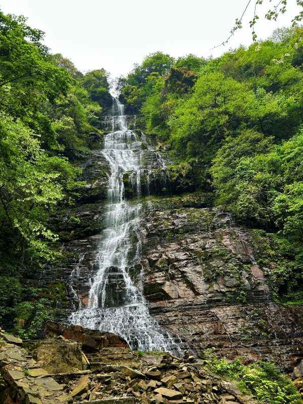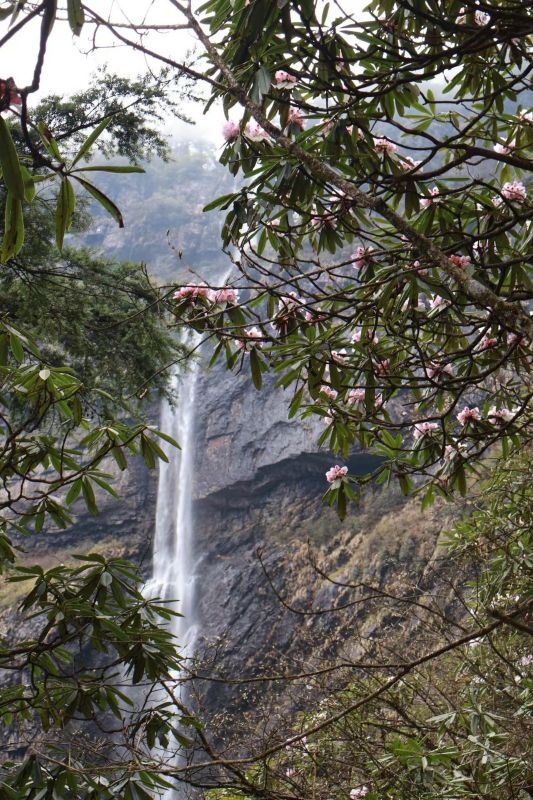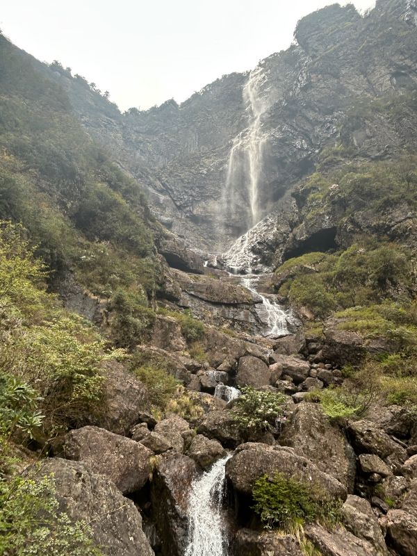 领队月亮认真负责,讲解清晰。瓦屋山低、中区都有很多台阶,带登山杖,最好也带护膝。目前瀑布水量还行,不大,大峡谷里很多沟壑都没有水。目前好看的就是杜鹃,需要在高山区才有,下面的都谢完了。