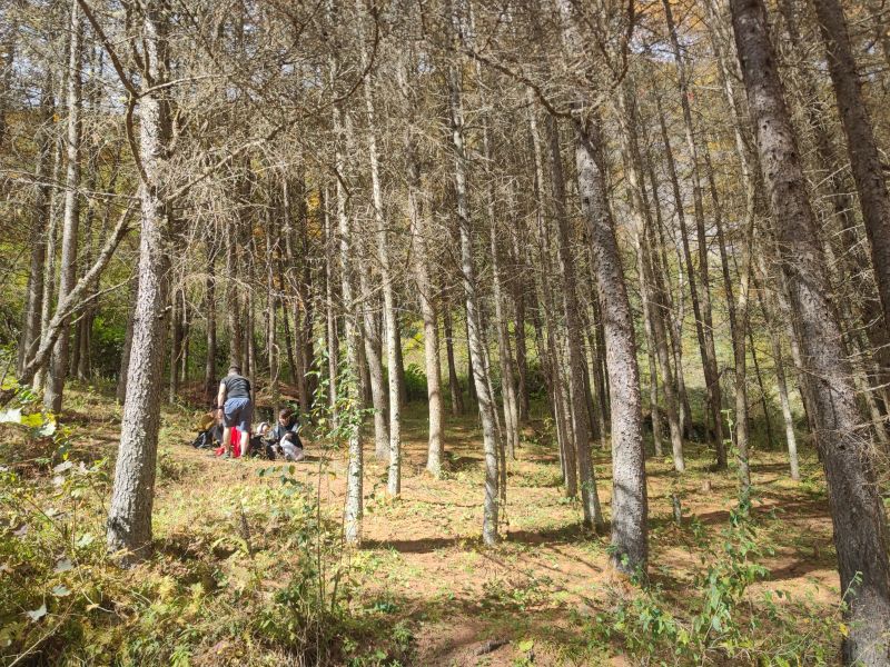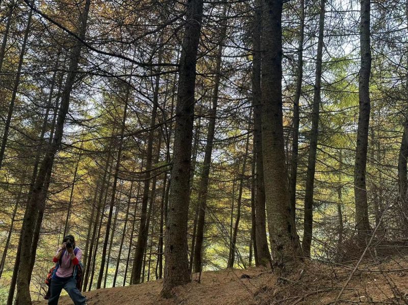天气很好,景色也不错,金黄的松林和四周群山的彩林都很美。松林略略谢得有点多,地面松针很厚,树上则有点少,估计上个团是最佳观赏时间。两位美女领队都很负责,还很热情地帮我拍照。海拔不高,距离也不远,轻松休闲拍美片。很好!