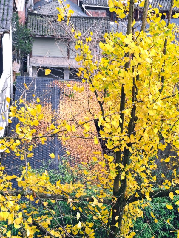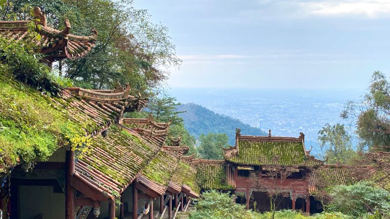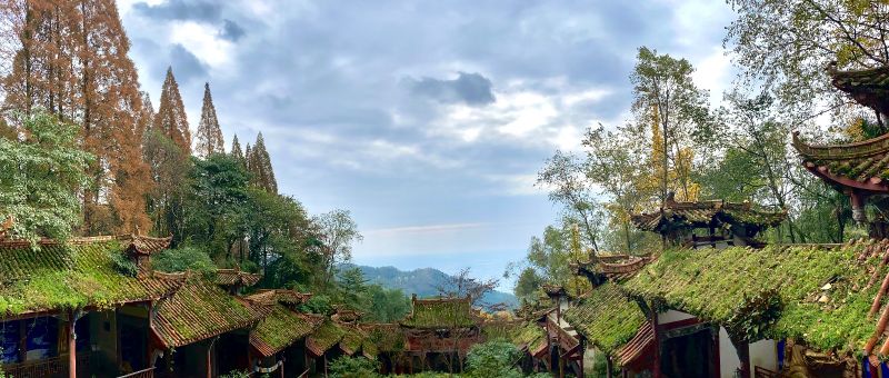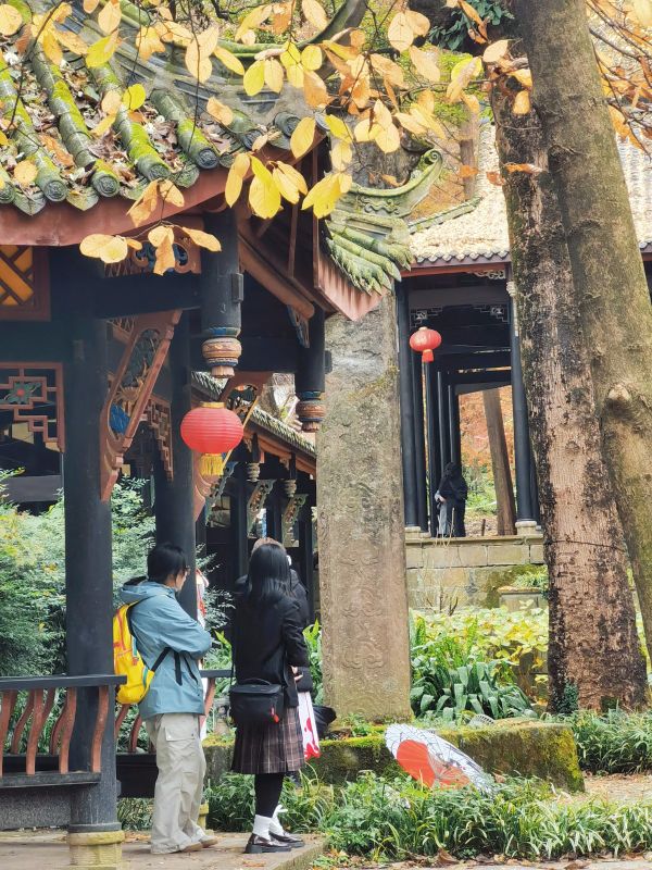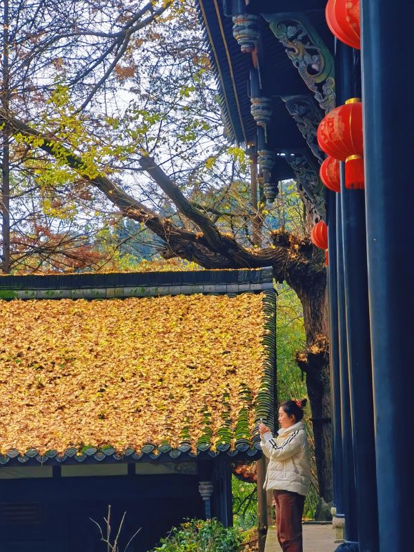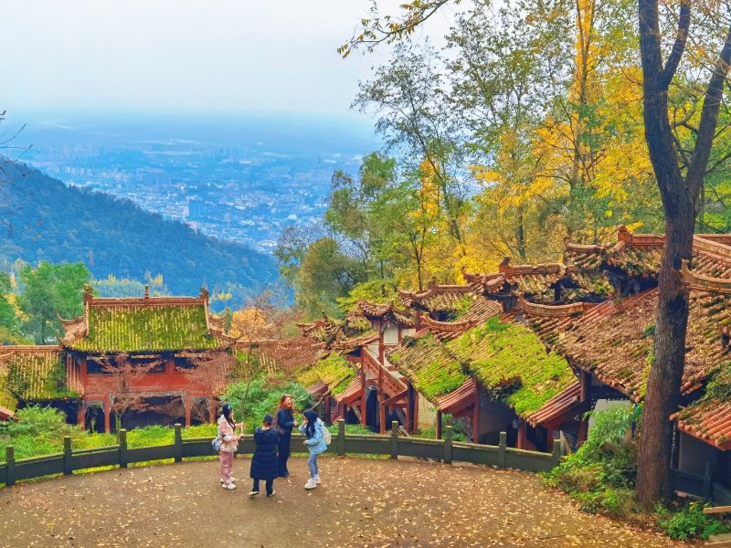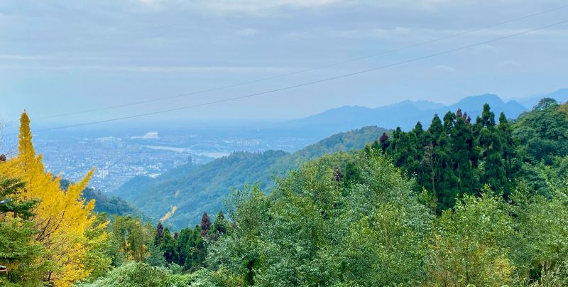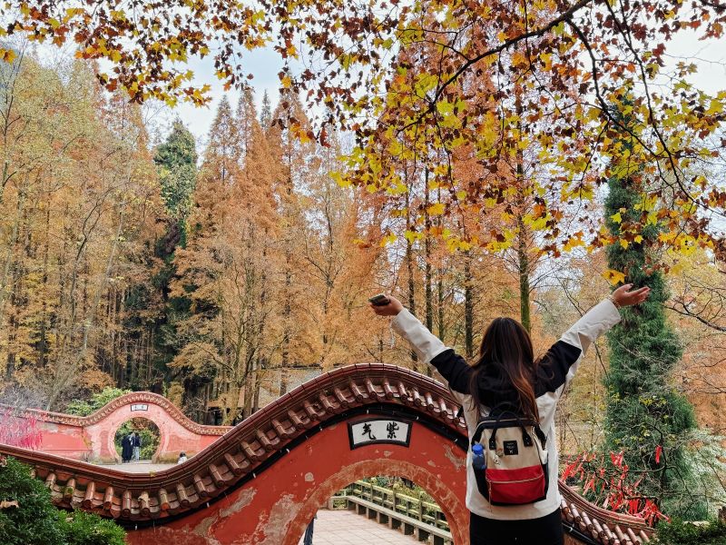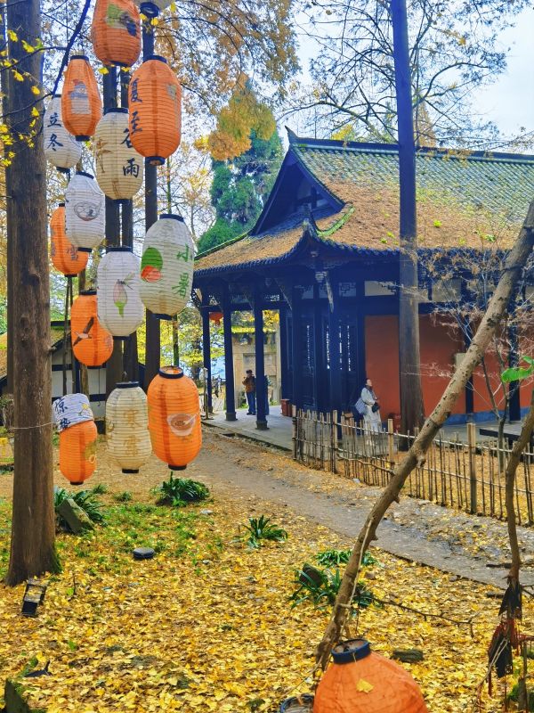 红灯笼木屋、苔藓石阶与飘落银杏,适合俯拍脚步特写。强推茶室观景台,彩林前景+都江堰全景,体验到真正的水墨画意境