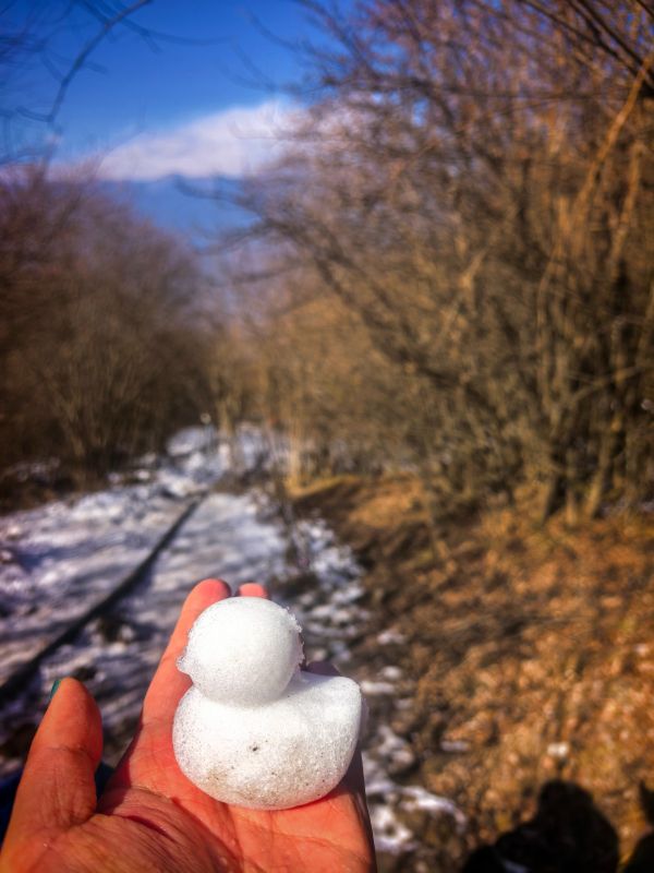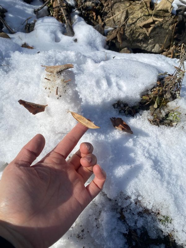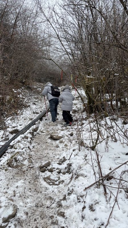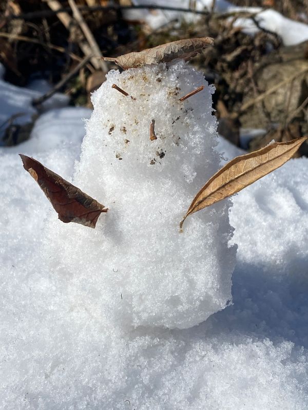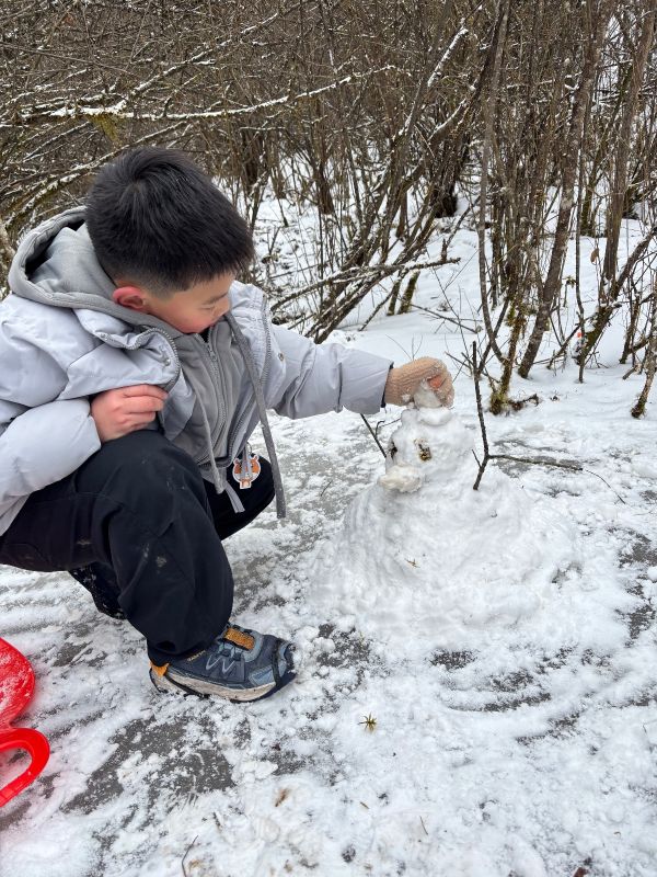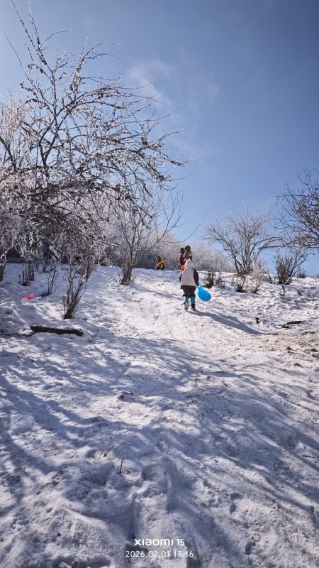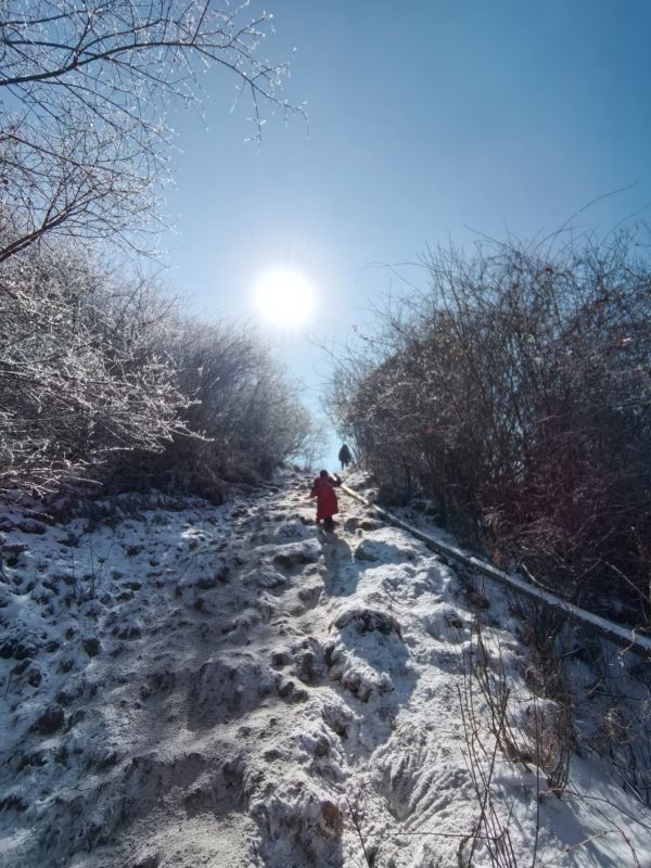 山上的雪还比较厚,可以堆个小雪人,一定要带冰爪,一定要带,要不然上不去,路很滑。