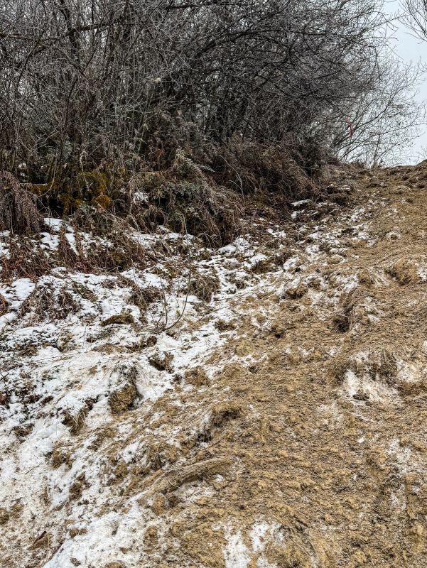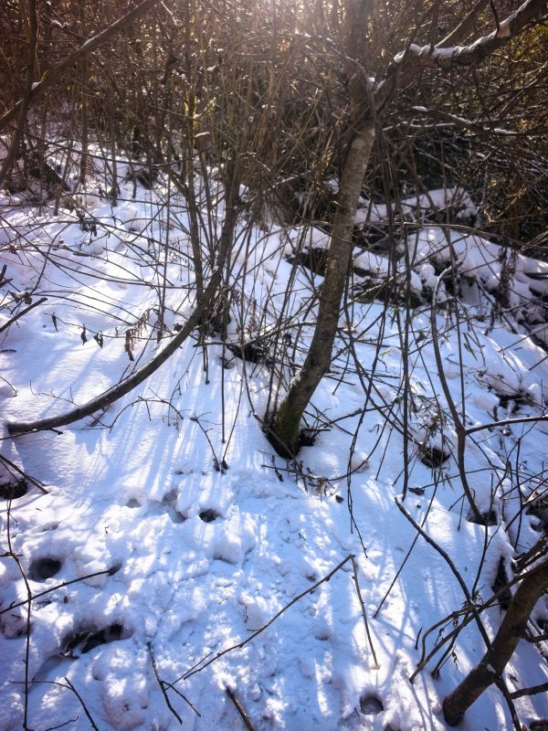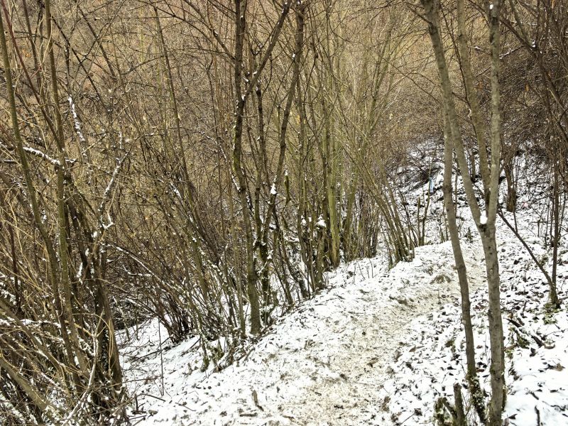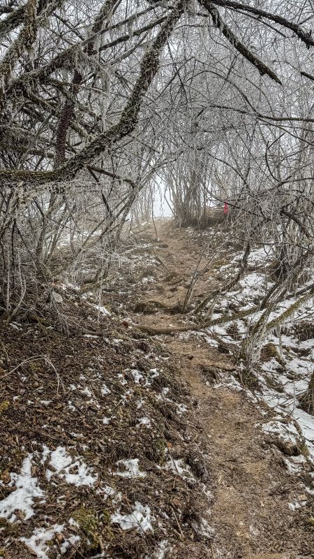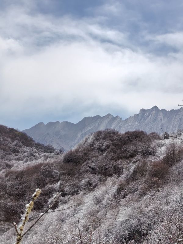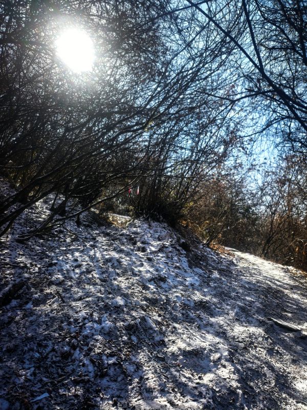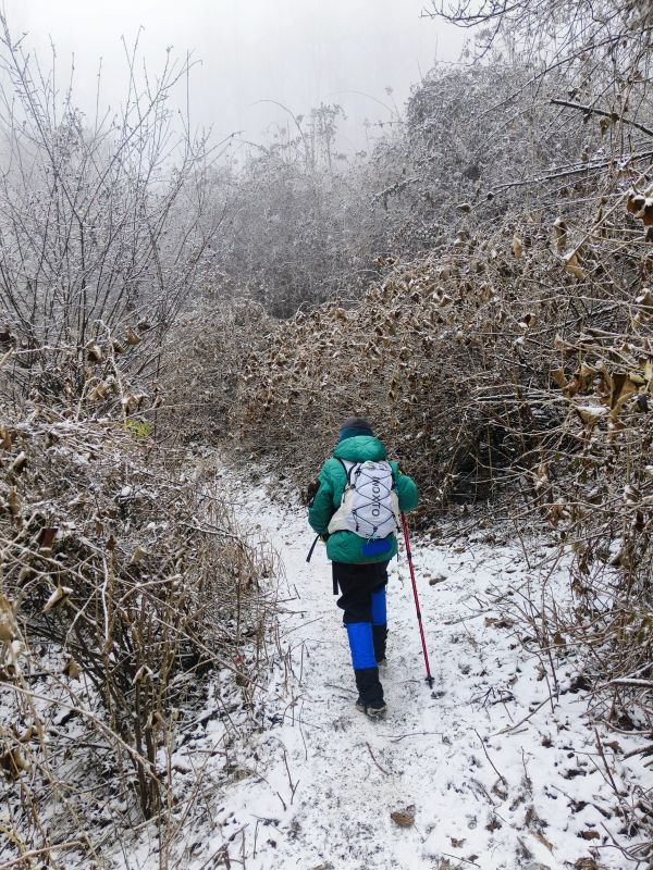 一路都有雪,只是还不是很厚,路程不远,就是爬升比较高,时间还是比较赶的。冰爪备好,一路还是很滑的