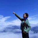 好天气,蓝天白云,云雾缭绕。尽管上山过程有些艰苦,但站在熊猫王国之巅石碑处,俯瞰周围群山,一切都值啦。