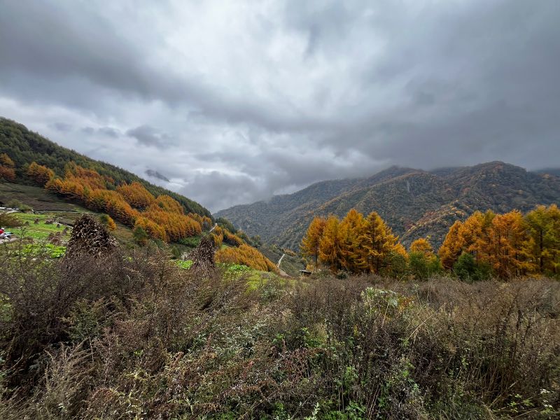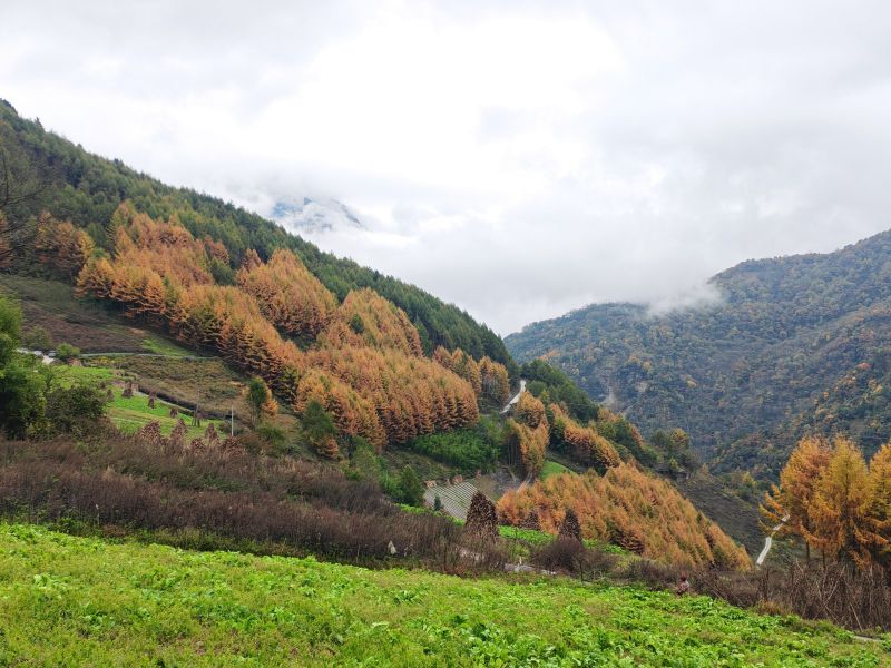 卧龙老鸦山位于耿达乡境内,老鸦山秋季以黄杉为主,登上空旷之地一眼望去,漫山黄杉尽收眼底,与山下的绿色有着清晰的分界线,带来强烈的视觉效果。