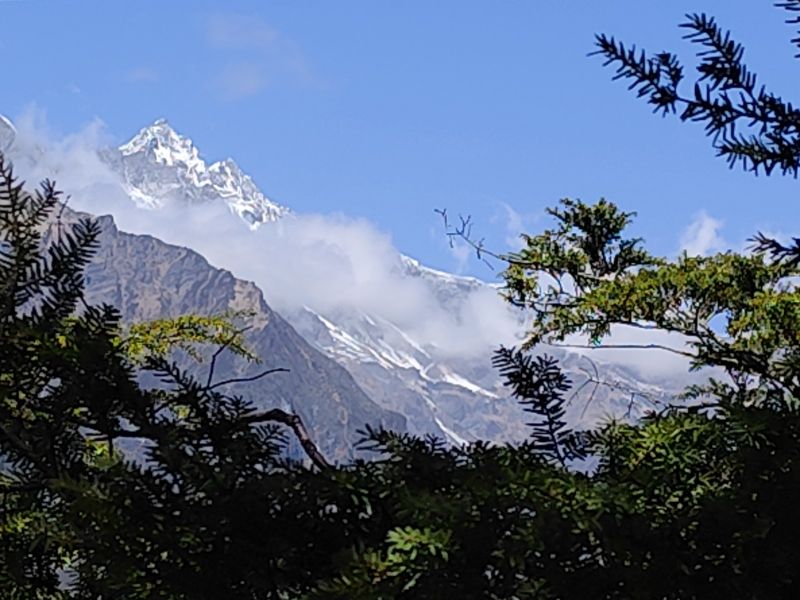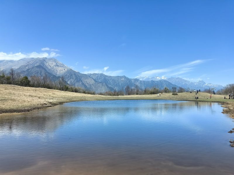 透过嫩绿的草叶儿依然能预见它碧空如洗的静美,草丛中点缀着各色草甸小野花,在春风中娇小且倔强。风徐徐而来,远处的雪山渐渐显露身姿,层层绿色在缥缈的云雾中忽明忽暗,云雾从山涧升腾而起或从山尖倾泻散漫开来,宛如仙境,美到窒息。