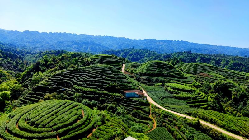 从空中俯瞰,四川雅安名山区云台山的茶园跌宕起伏、造型犹如大地的“指纹”