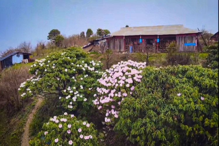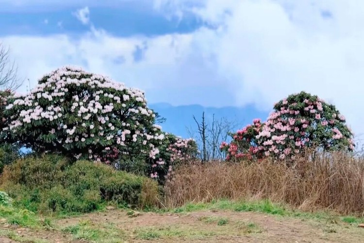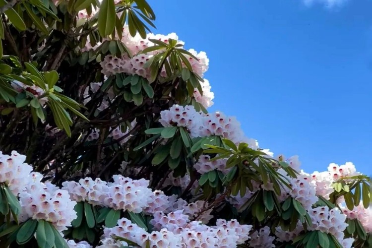 与普通杜鹃不同,彭州天台山的杜鹃是珍稀的高山云锦杜鹃,多是数十年乃至上百年的老桩,植株高大,枝干遒劲,每年 4 月中旬,便是它们的盛花期,粉白、淡紫、浅红的花朵,一簇簇缀满枝头,花型硕大饱满,一朵挨着一朵,开得热烈而肆意。